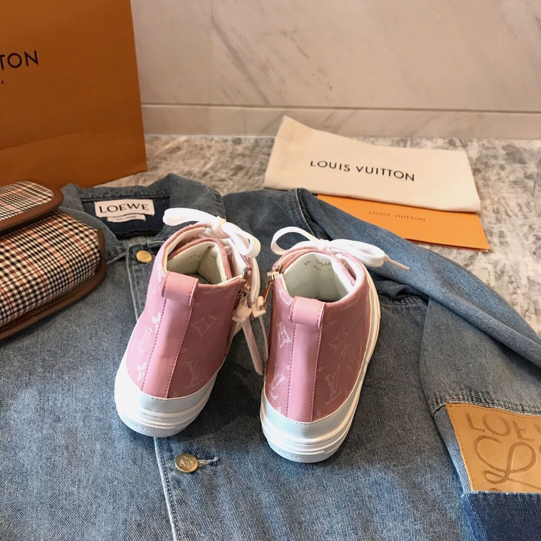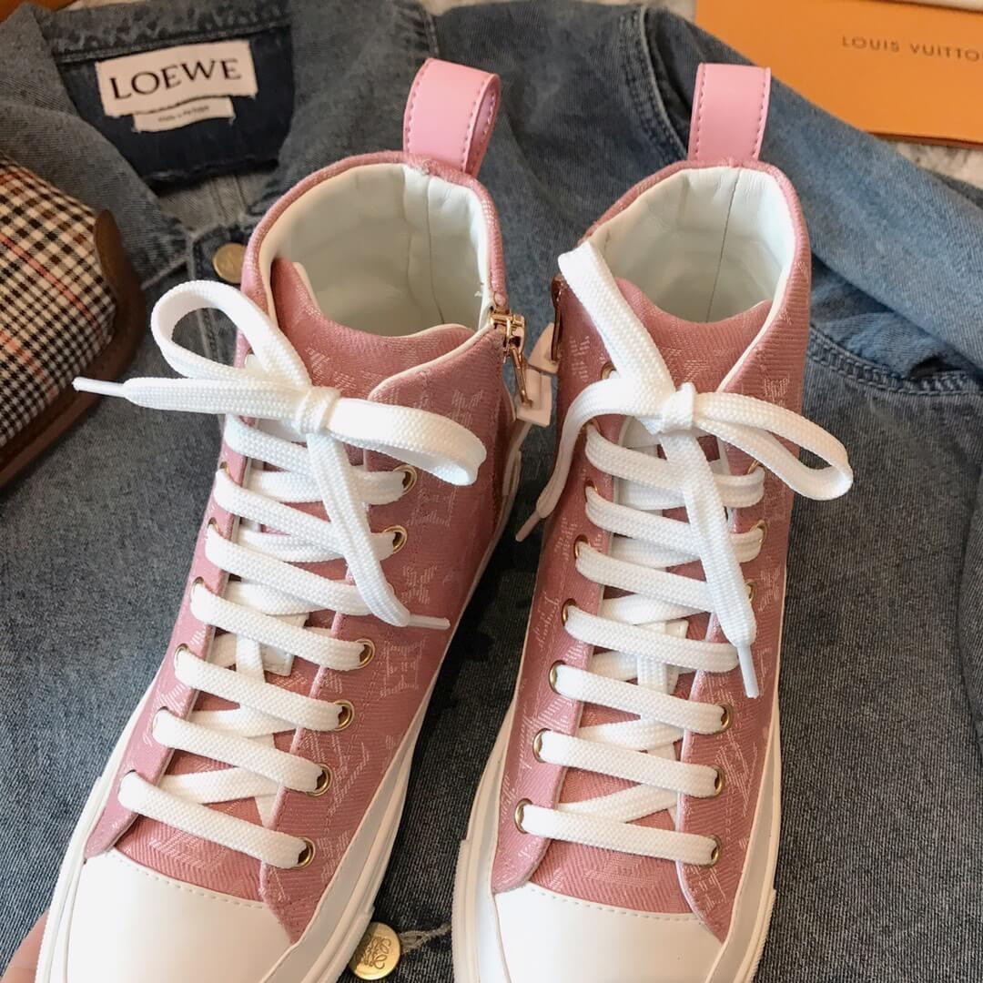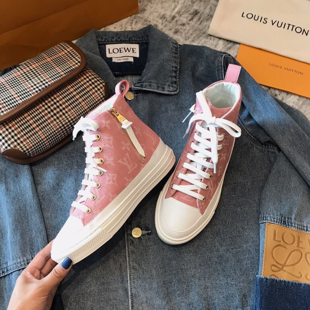 One of Louis Vuitton's most recognizable styles, the Stellar sneaker boot now comes in iconic Monogram denim. The bright white laces, toe cap and rubber outsole contrast with the blue of the denim to give this hi-top a casual, summery feel. A side zip allows for easy fitting.