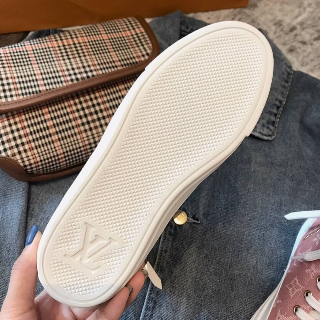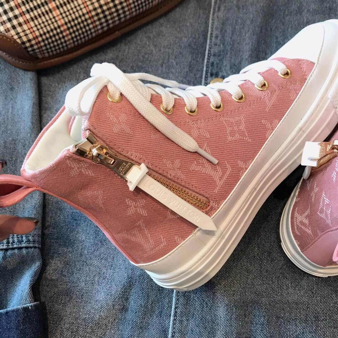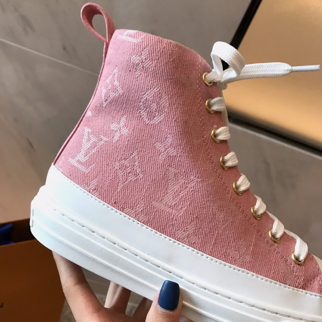 One of Louis Vuitton's most recognizable styles, the Stellar sneaker boot now comes in iconic Monogram denim. The bright white laces, toe cap and rubber outsole contrast with the blue of the denim to give this hi-top a casual, summery feel. A side zip allows for easy fitting.