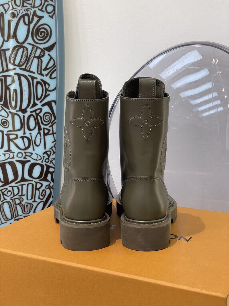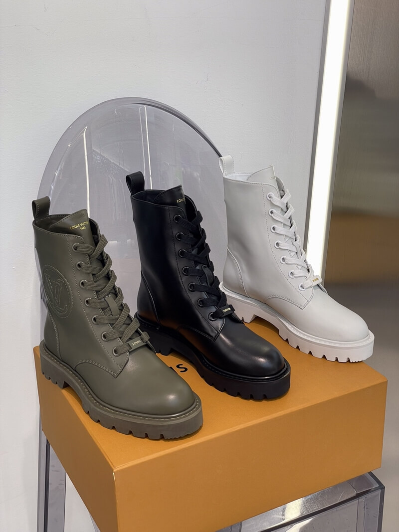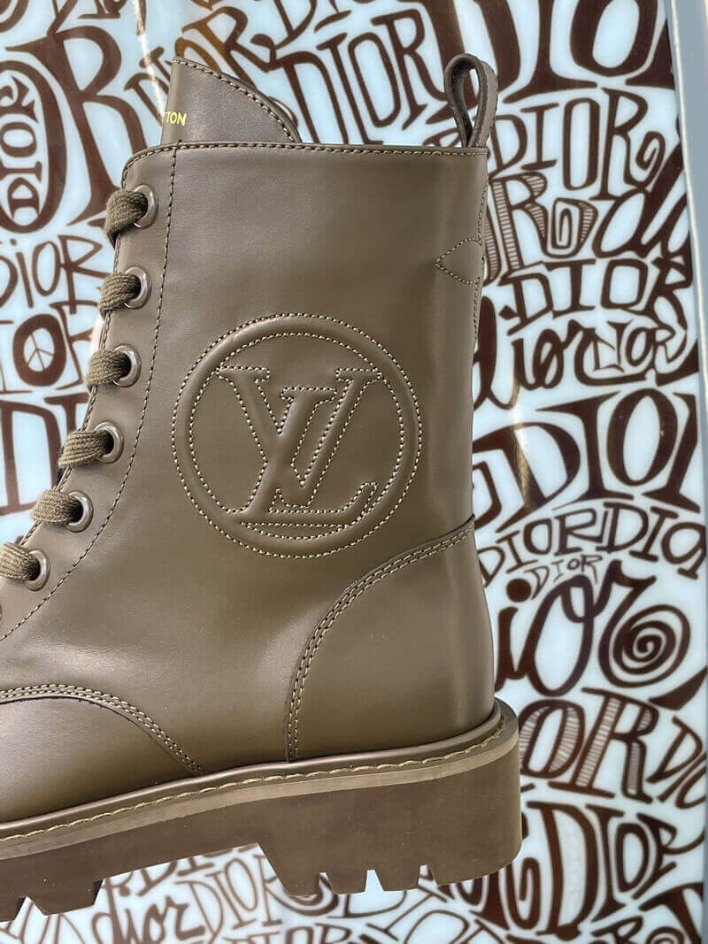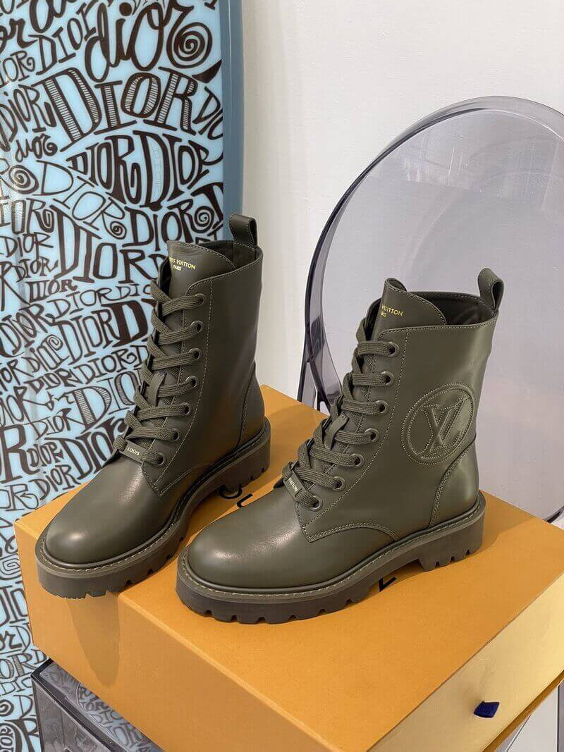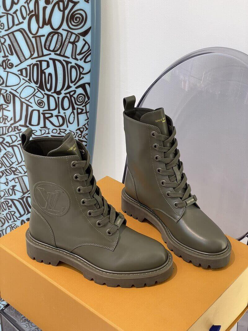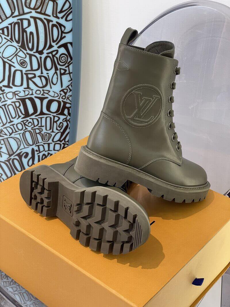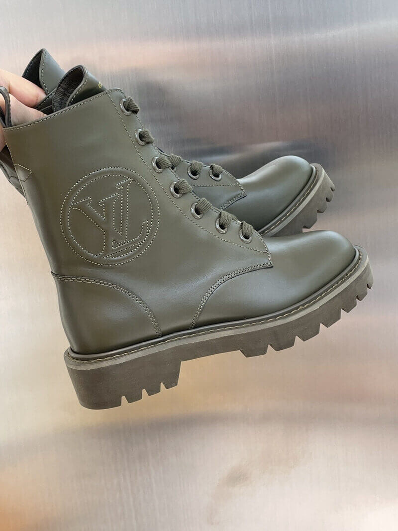With its treaded outsole and long laces, the Territory flat ranger draws inspiration from hiking and combat boots. This version comes in supple calf leather with an oversized LV Circle logo debossed on the side. The rubber outsole is color-matched to the upper for an original, "dipped-in-paint" effect.