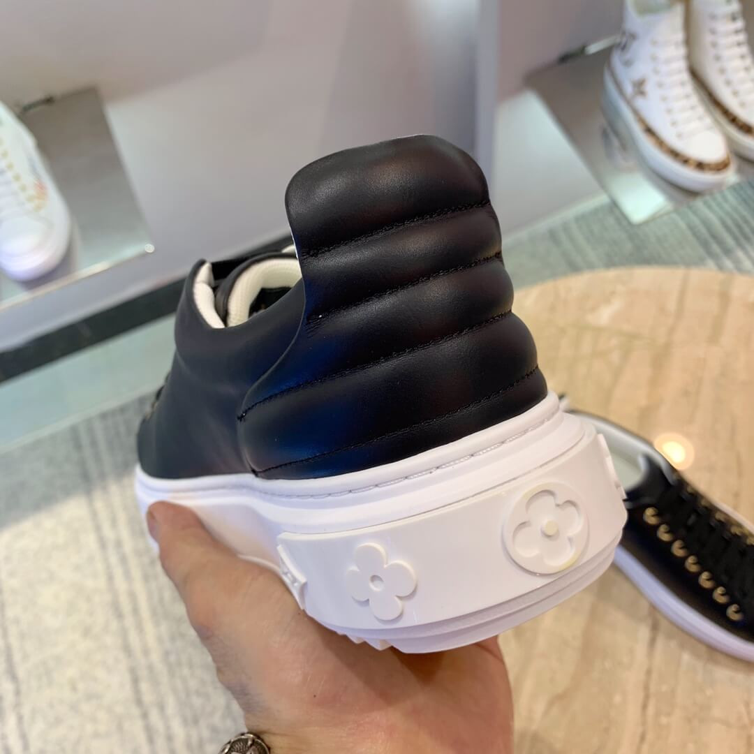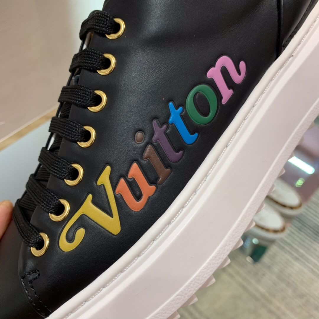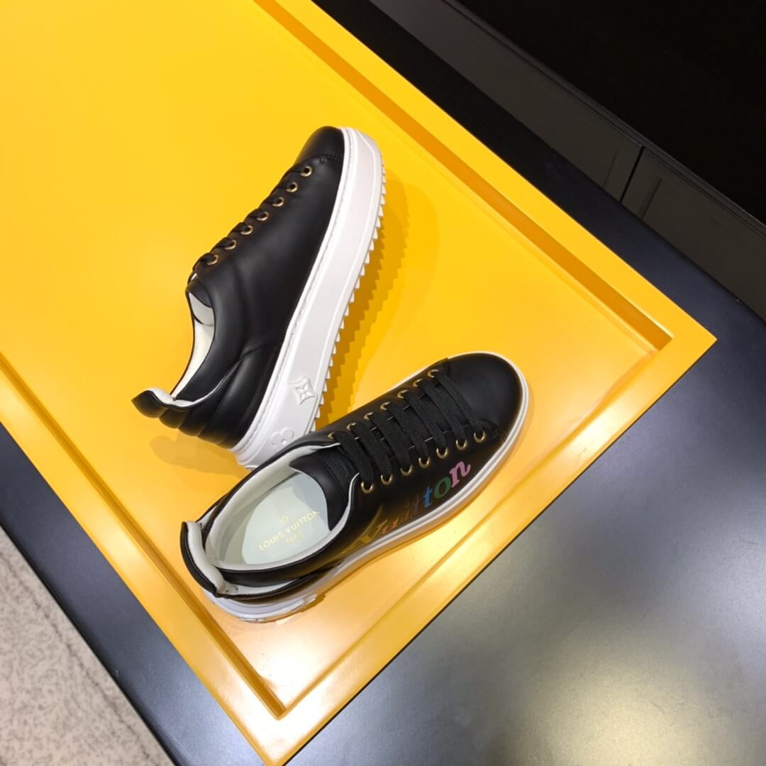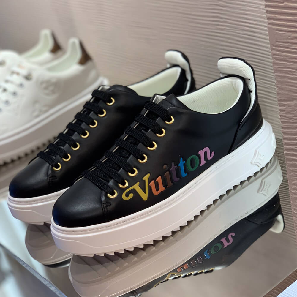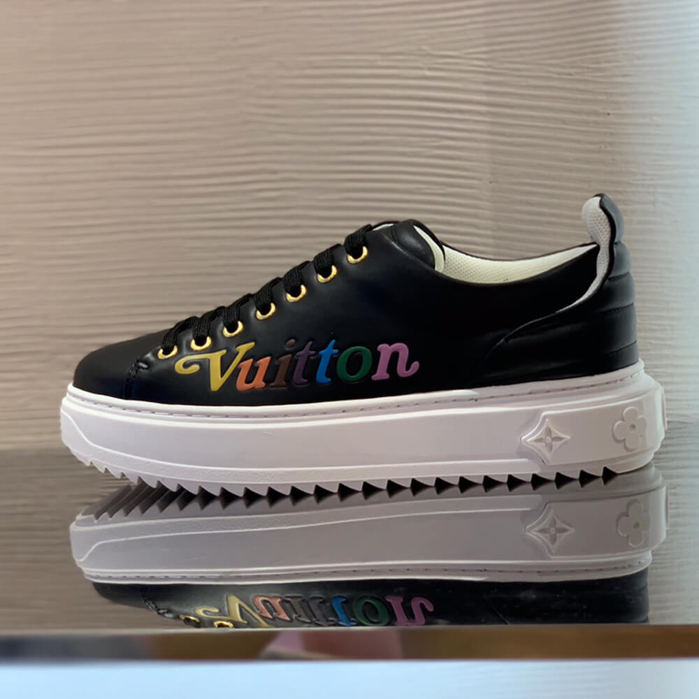 The Time Out sneaker in supple calf leather is an on-trend design with a distinctive elevated outsole. This version is debossedwith a rainbow-colored Vuitton signature, which was inspired by the cult New Wave handbag. The sneaker also features a quilted back echoing the bag's characteristic wave-pattern quilting.