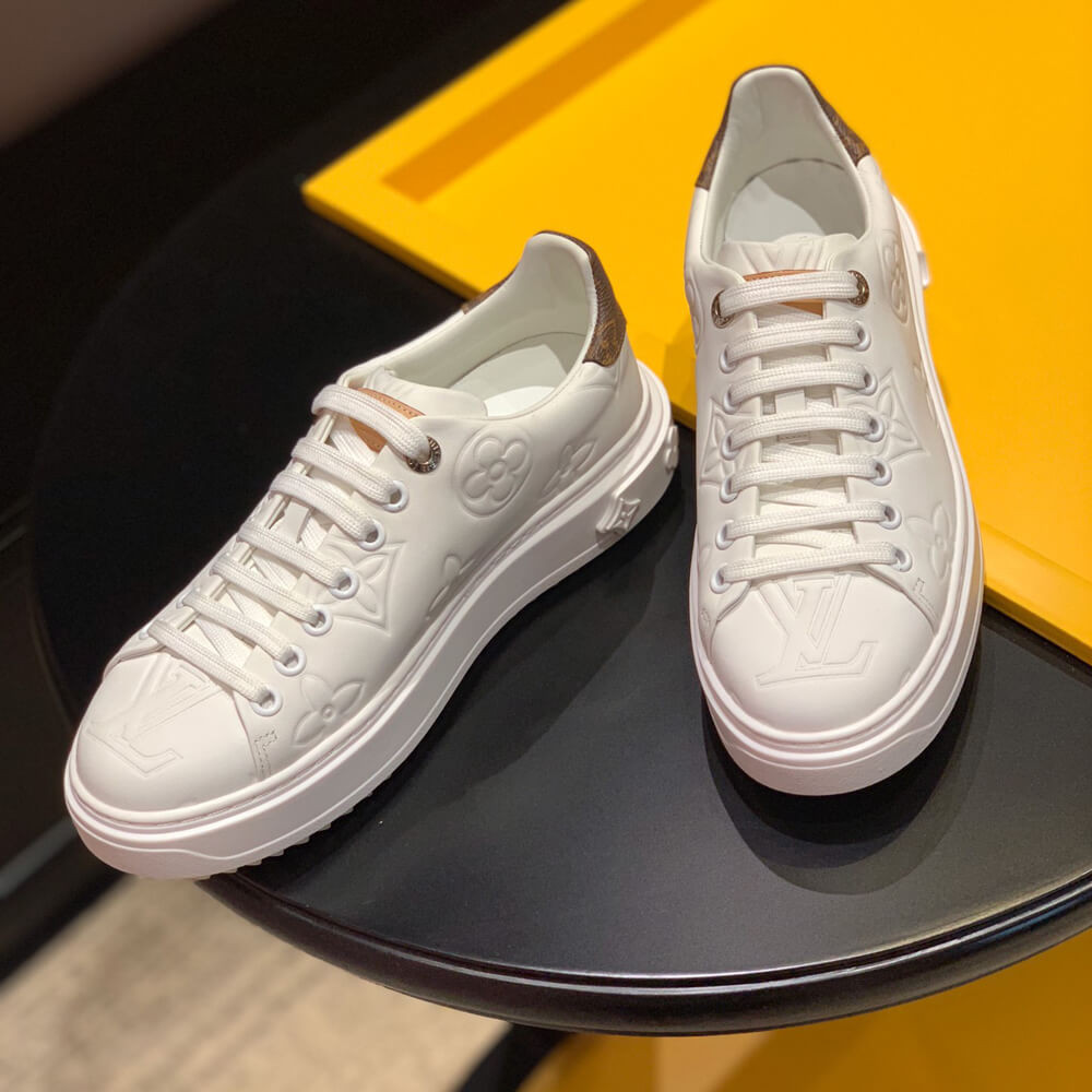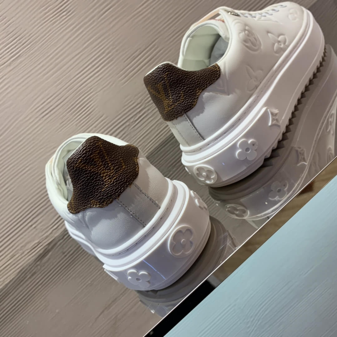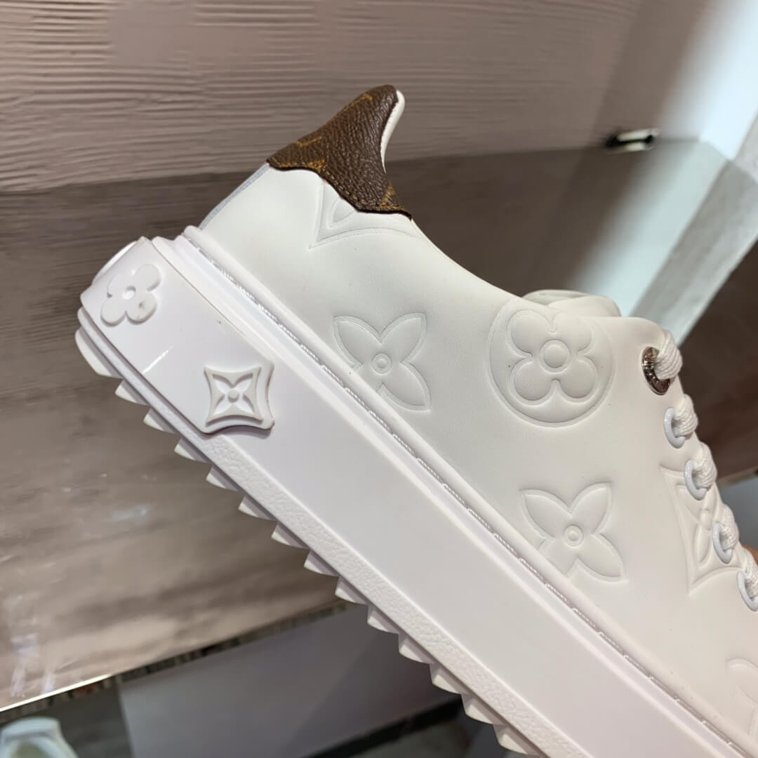 Louis Vuitton's Time Out sneaker is revisited in exceptionally soft white lambskin, which is embossed with a giant Monogram pattern. This design is characterized by its clean lines and on-trend elevated outsole, which features a motif of Monogram Flowers. The back of the sneaker is trimmed with Monogram canvas.