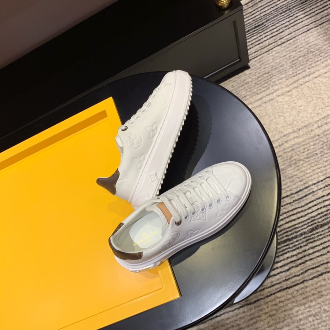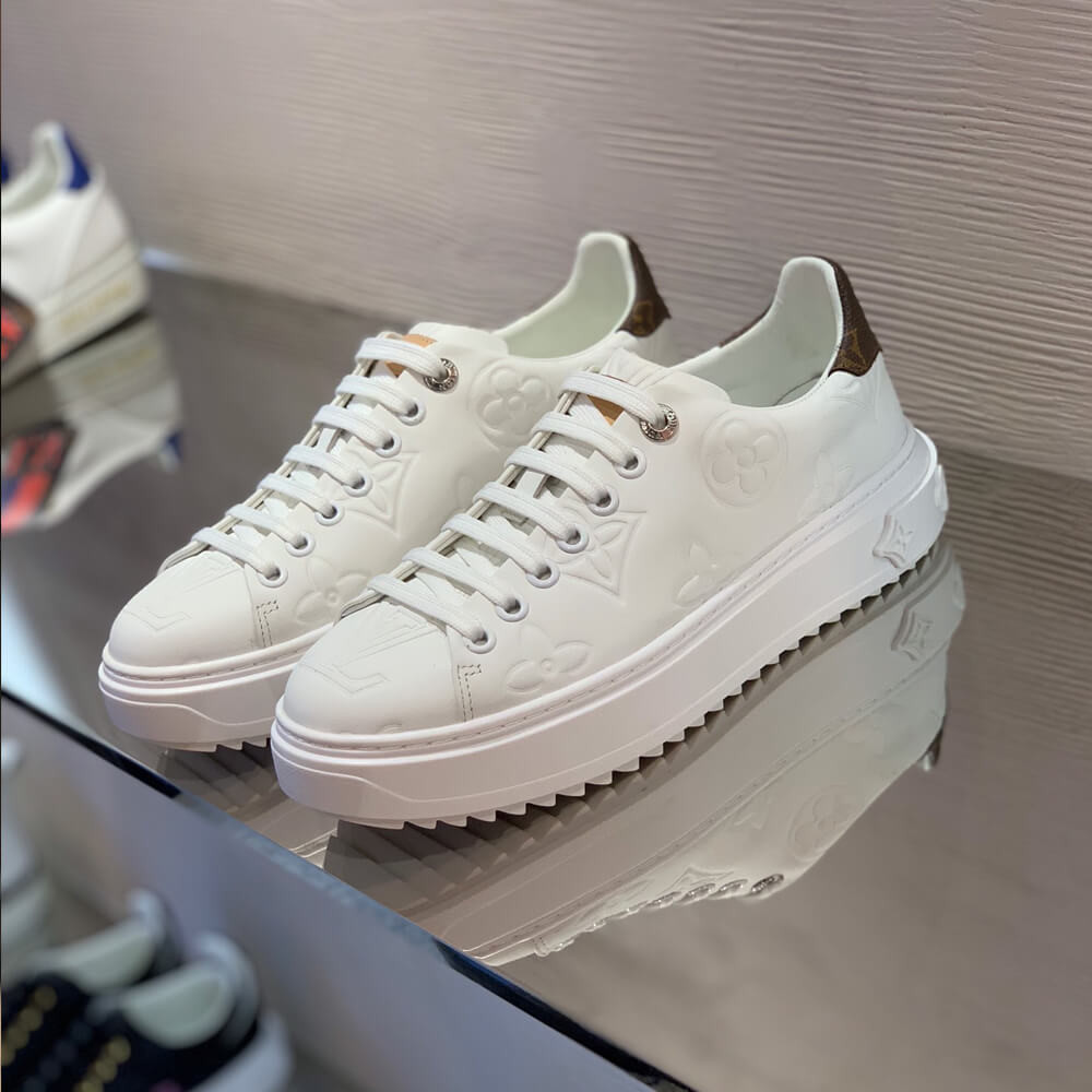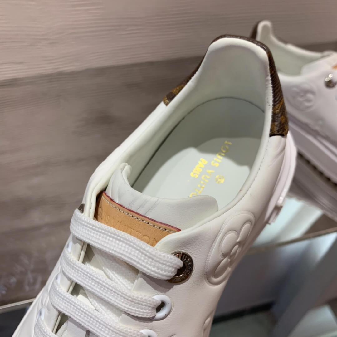 Louis Vuitton's Time Out sneaker is revisited in exceptionally soft white lambskin, which is embossed with a giant Monogram pattern. This design is characterized by its clean lines and on-trend elevated outsole, which features a motif of Monogram Flowers. The back of the sneaker is trimmed with Monogram canvas.