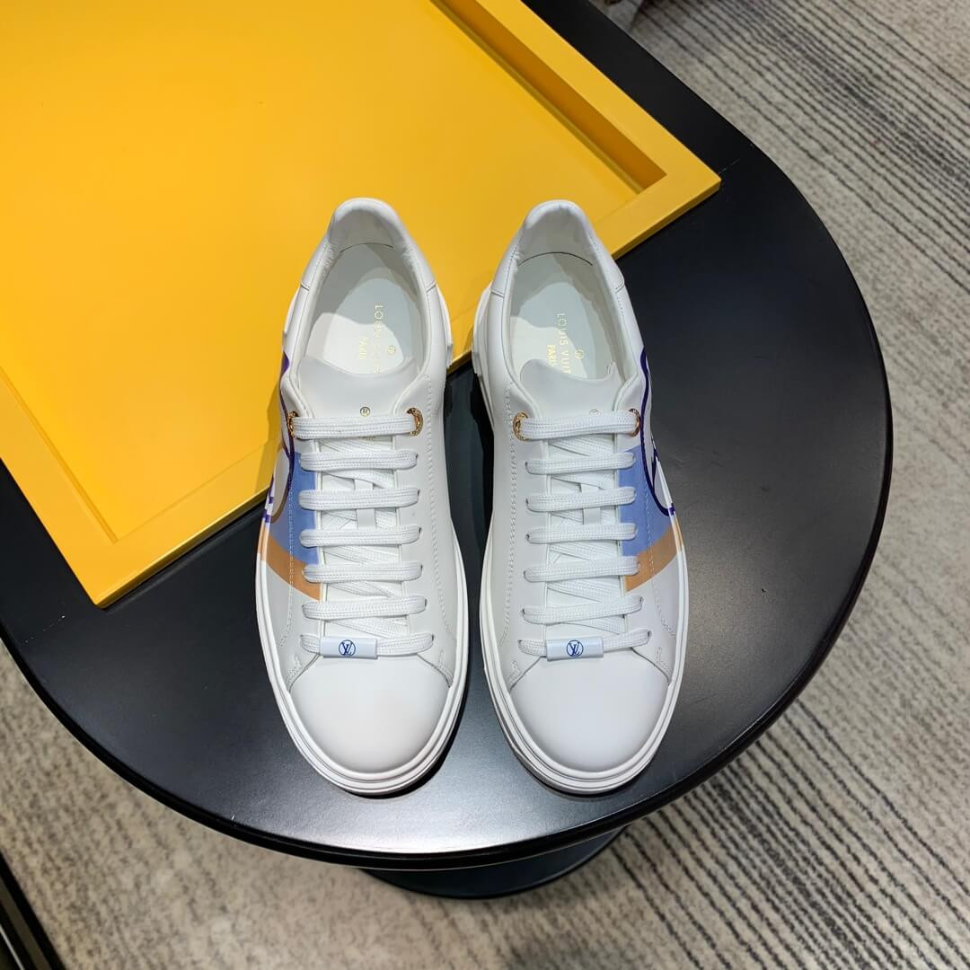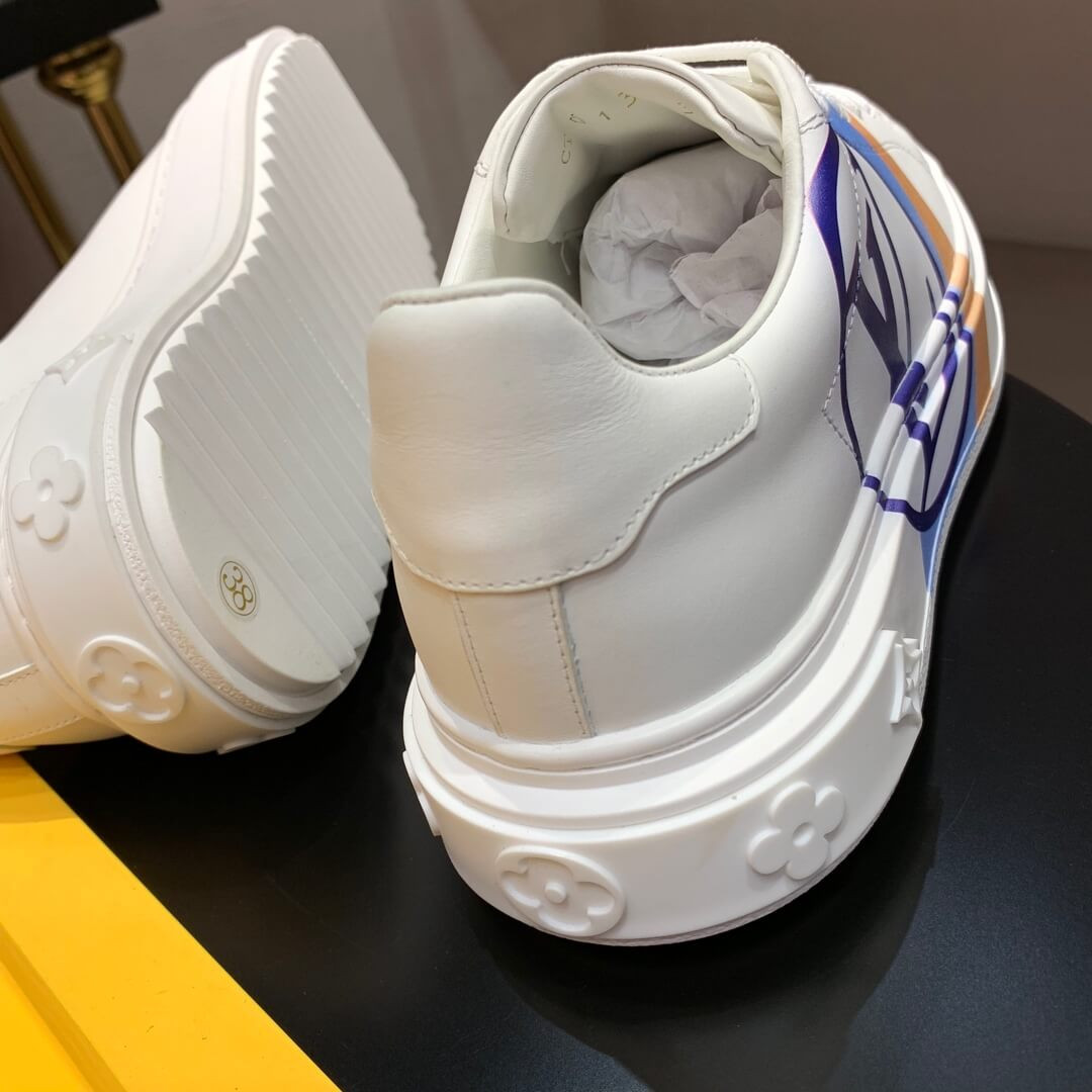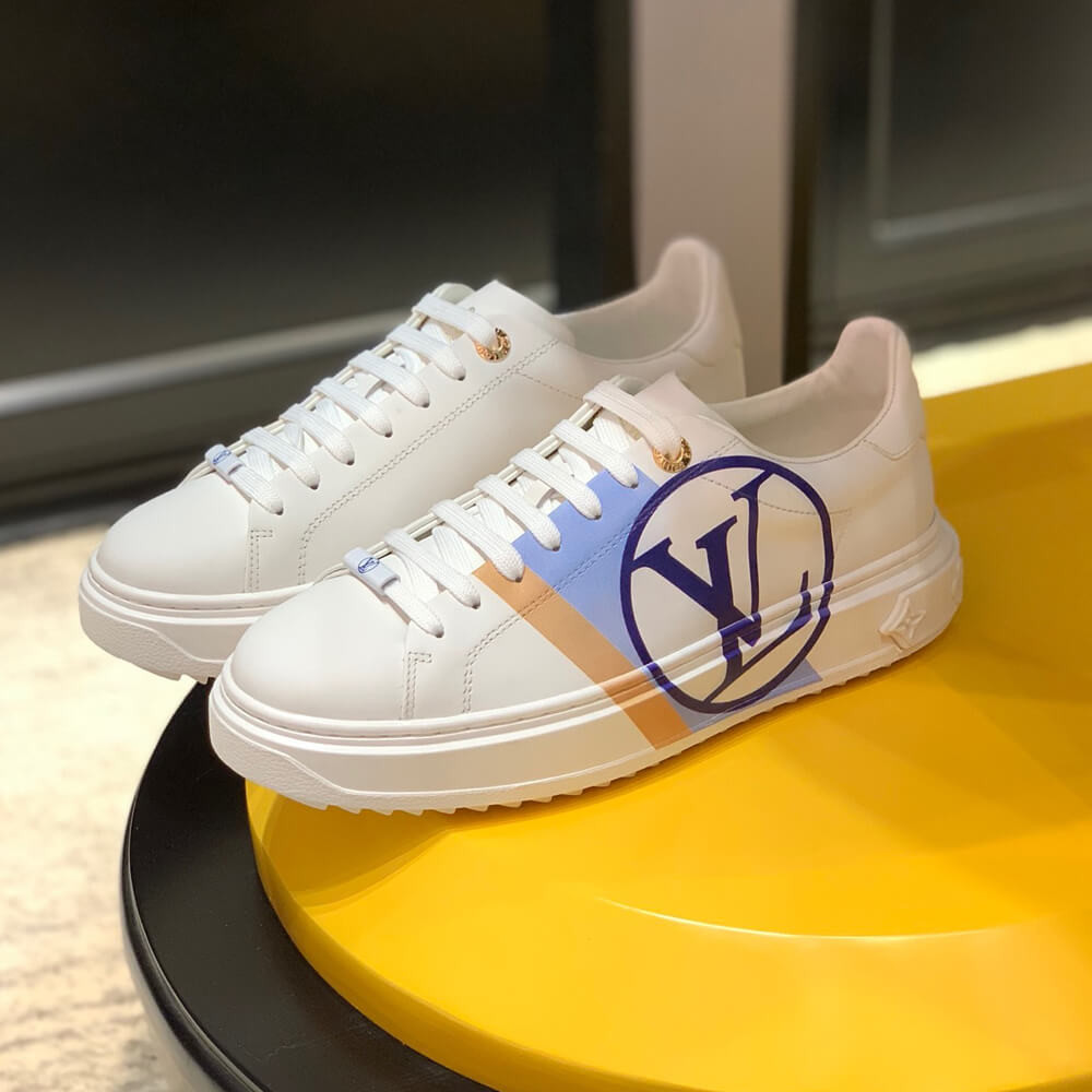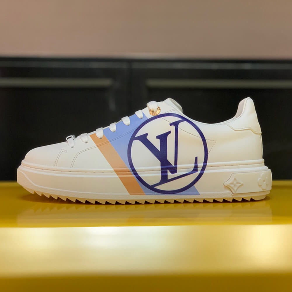The Time Out sneaker is crafted from soft white calf leather, which is emblazoned with a graphic stripe and an oversized LV Circlesignature. This sneaker is notable for its fashionable elevated outsole with a motif of Monogram Flowers. The Louis Vuitton signature is embossed in gold on the tongue.