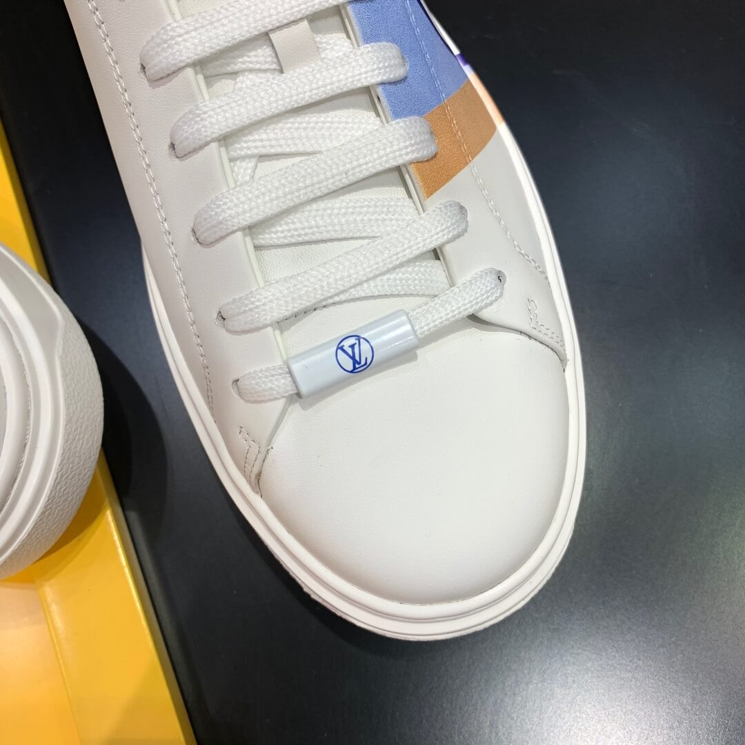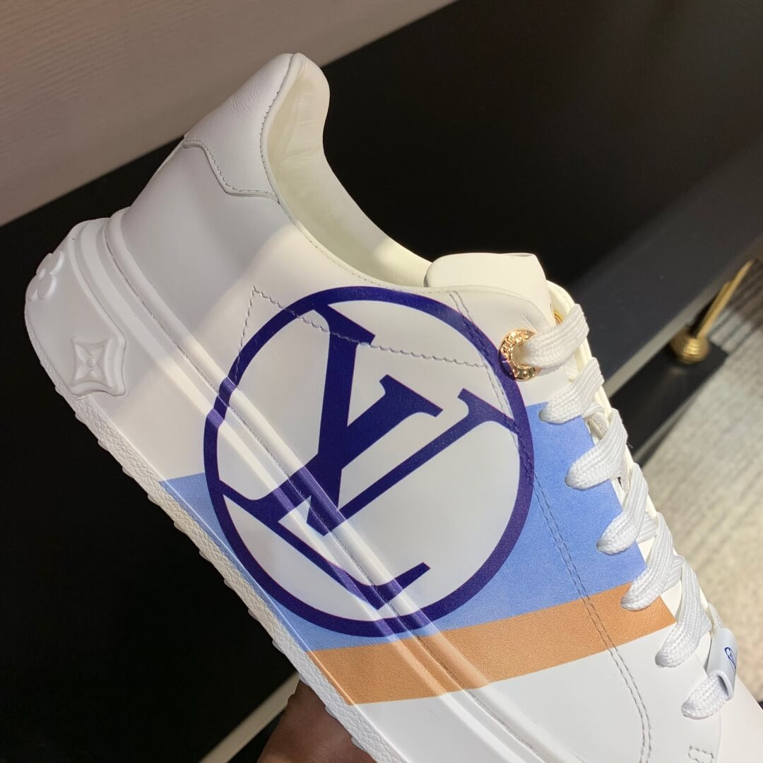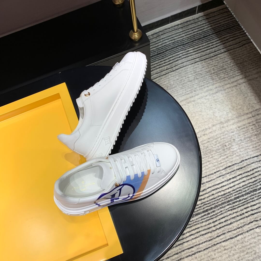 The Time Out sneaker is crafted from soft white calf leather, which is emblazoned with a graphic stripe and an oversized LV Circlesignature. This sneaker is notable for its fashionable elevated outsole with a motif of Monogram Flowers. The Louis Vuitton signature is embossed in gold on the tongue.