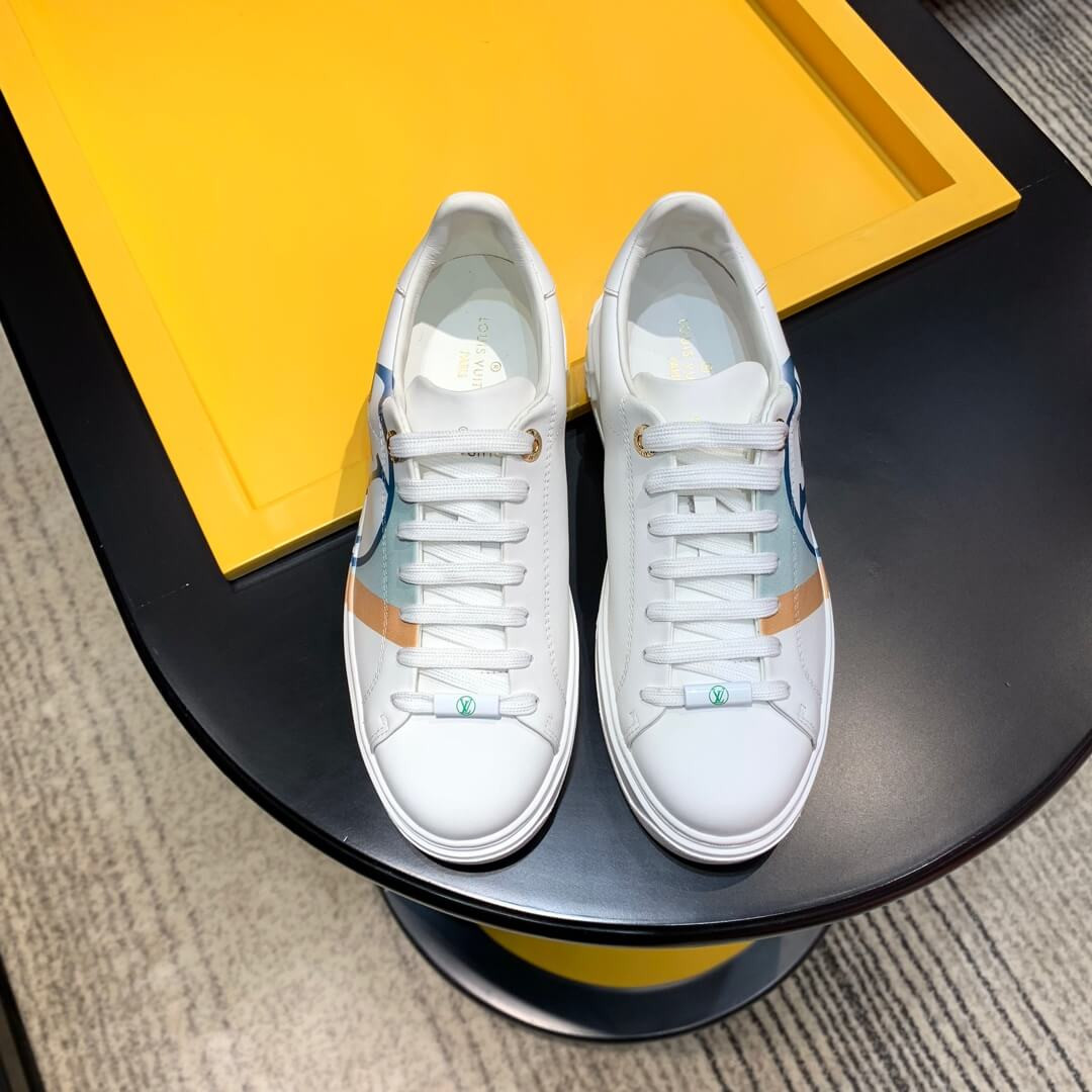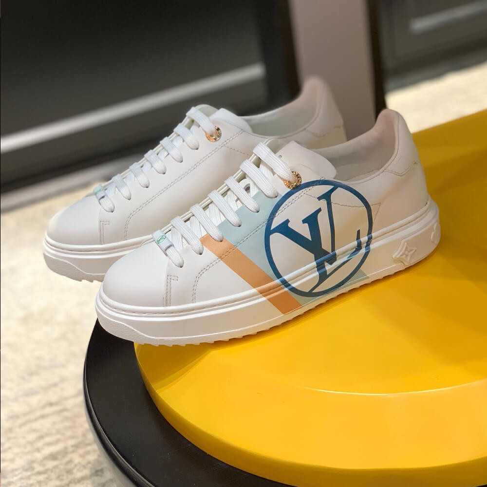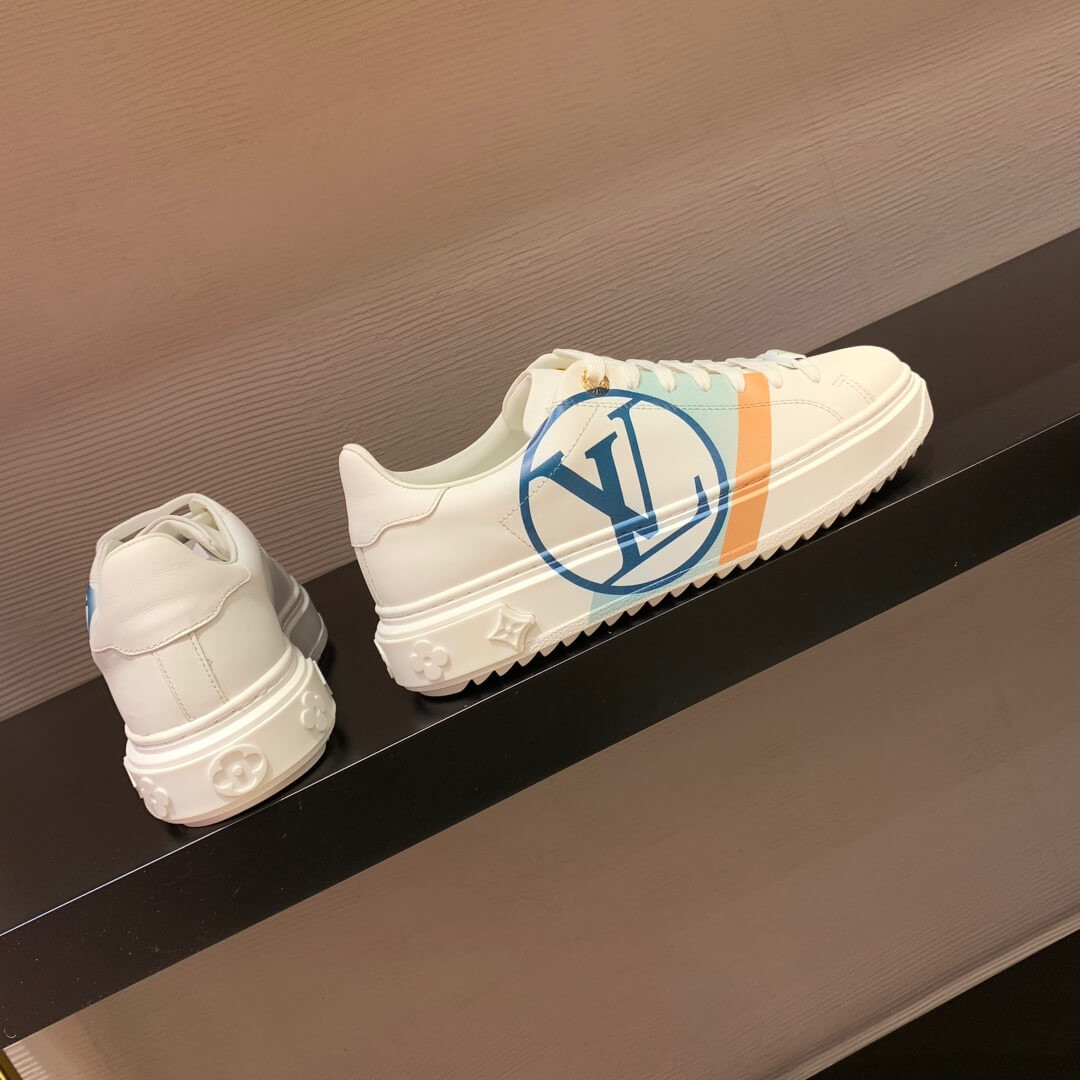The Time Out sneaker is crafted from soft white calf leather, which is emblazoned with a graphic stripe and an oversized LV Circle signature. This sneaker is notable for its fashionable elevated outsole with a motif of Monogram Flowers. The Louis Vuitton signature is embossed in gold on the tongue.