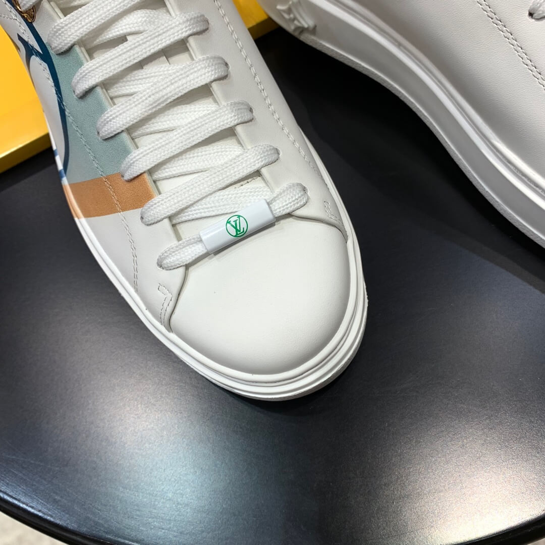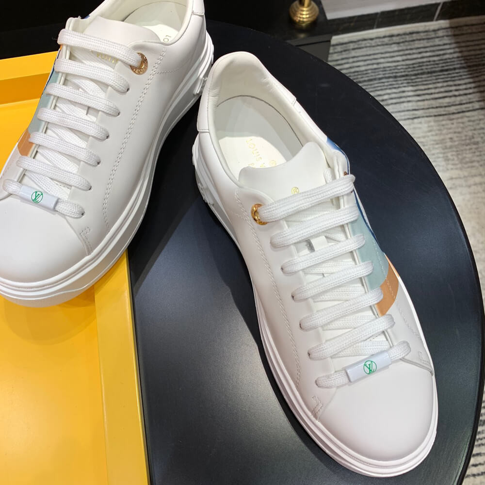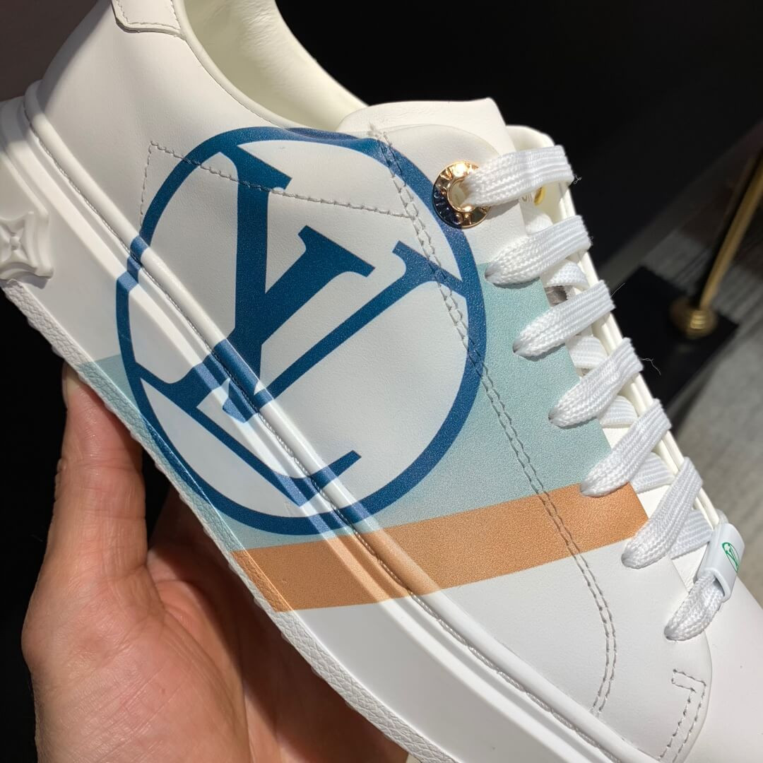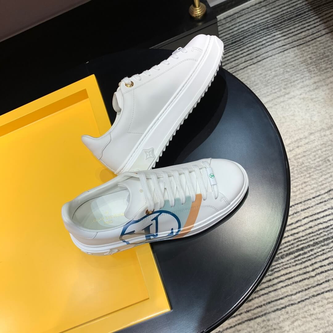 The Time Out sneaker is crafted from soft white calf leather, which is emblazoned with a graphic stripe and an oversized LV Circle signature. This sneaker is notable for its fashionable elevated outsole with a motif of Monogram Flowers. The Louis Vuitton signature is embossed in gold on the tongue.