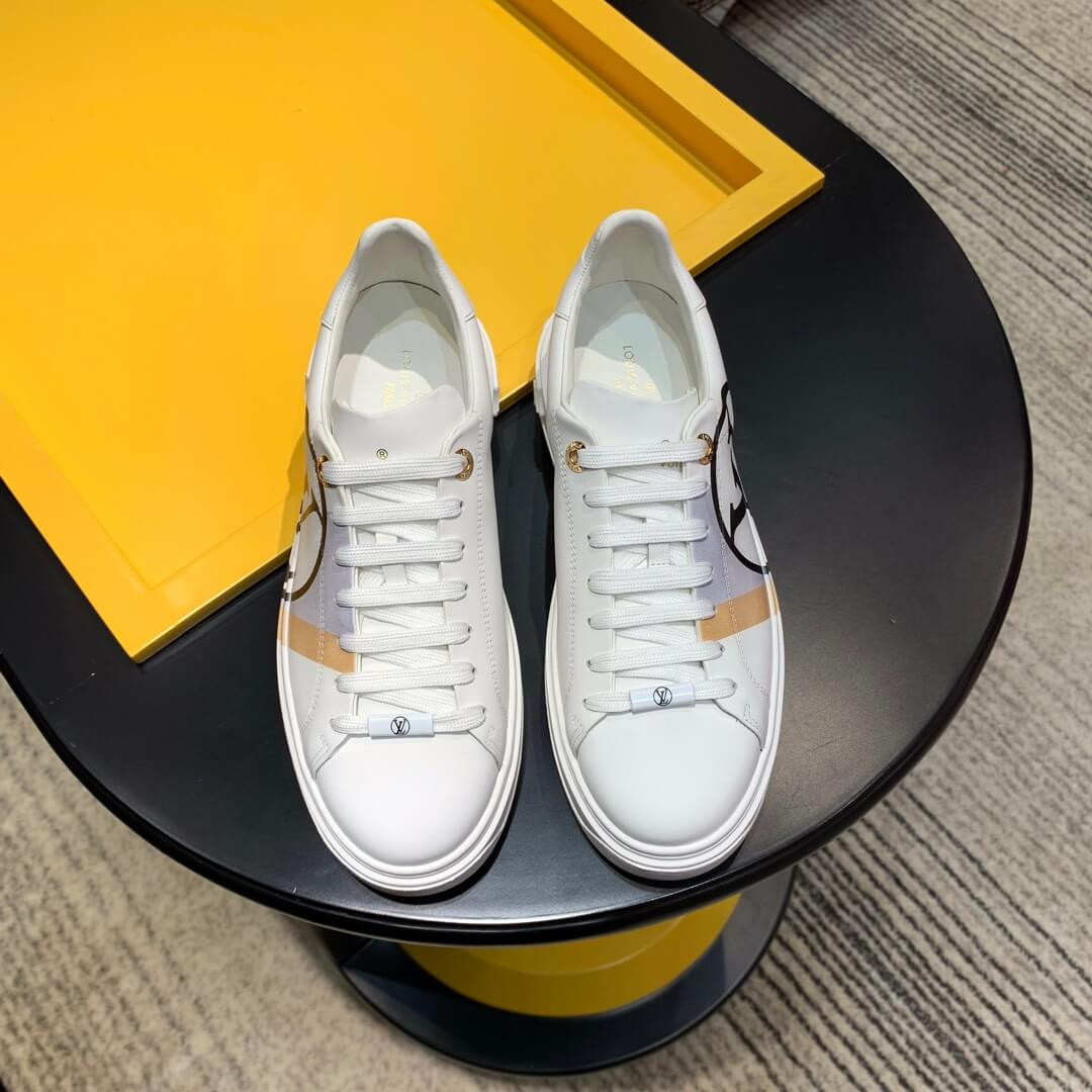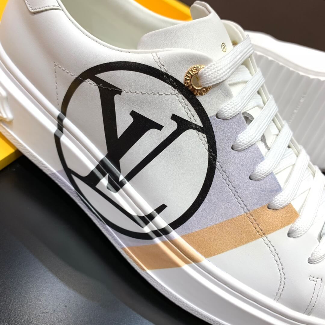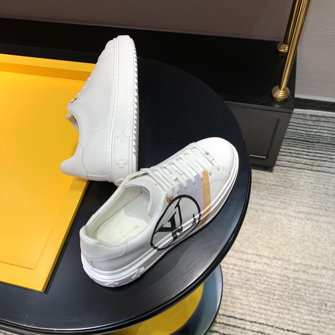 The Time Out sneaker is crafted from soft white calf leather, which is emblazoned with a graphic stripe and an oversized LV Circle signature. This sneaker is notable for its fashionable elevated outsole with a motif of Monogram Flowers. The Louis Vuitton signature is embossed in gold on the tongue.