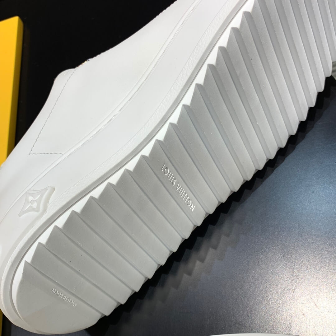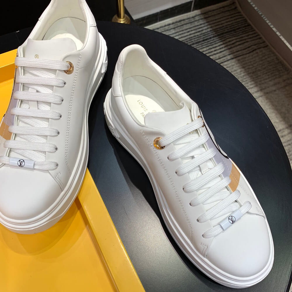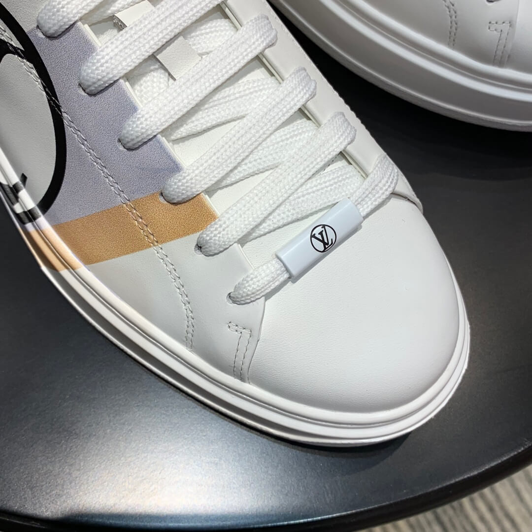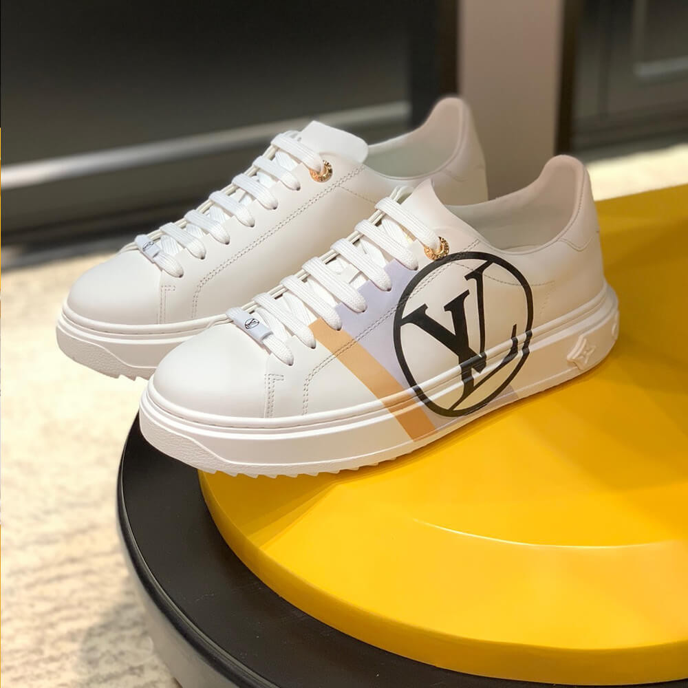 The Time Out sneaker is crafted from soft white calf leather, which is emblazoned with a graphic stripe and an oversized LV Circle signature. This sneaker is notable for its fashionable elevated outsole with a motif of Monogram Flowers. The Louis Vuitton signature is embossed in gold on the tongue.