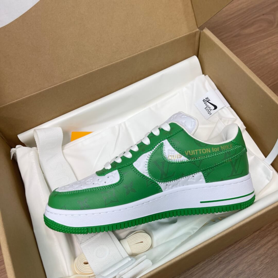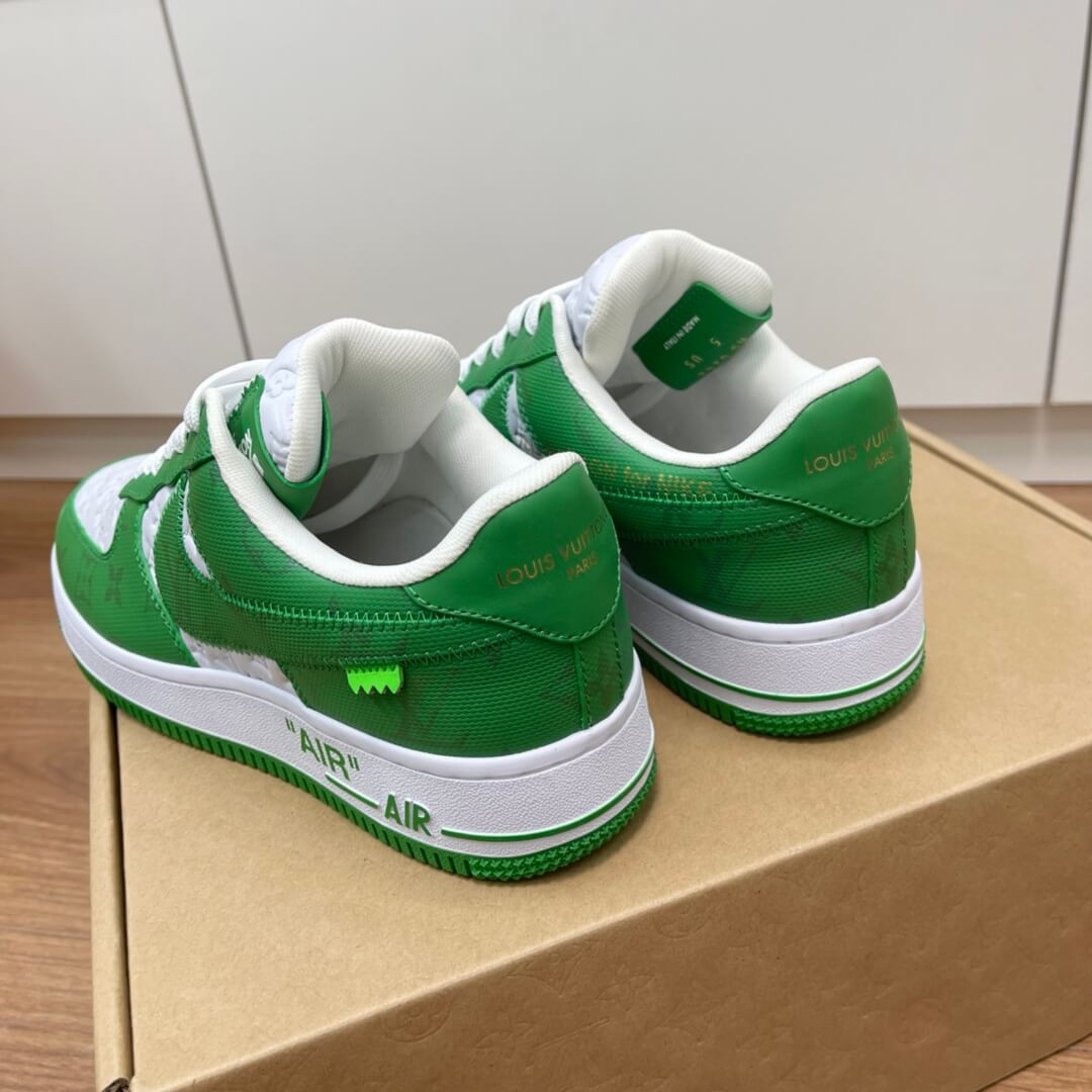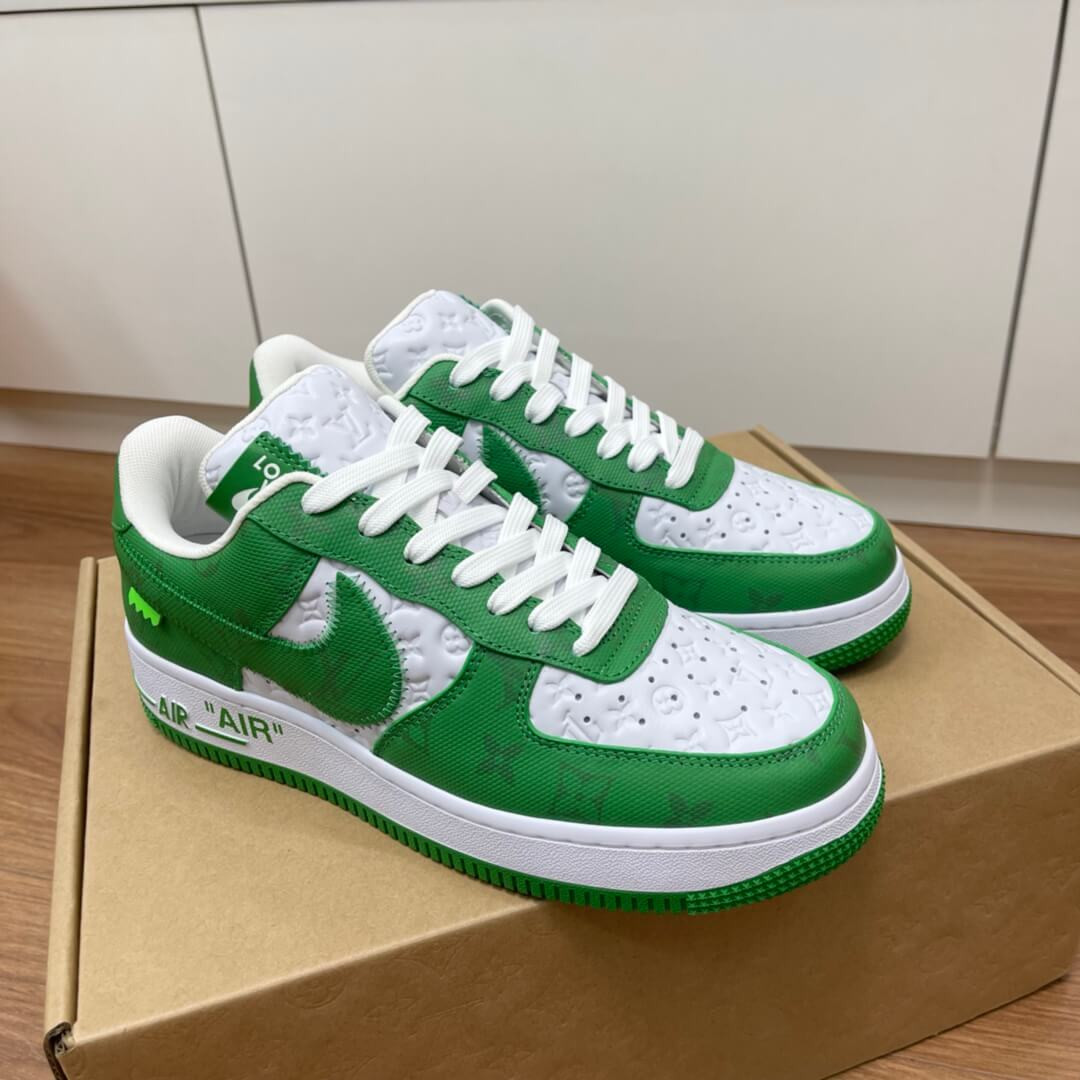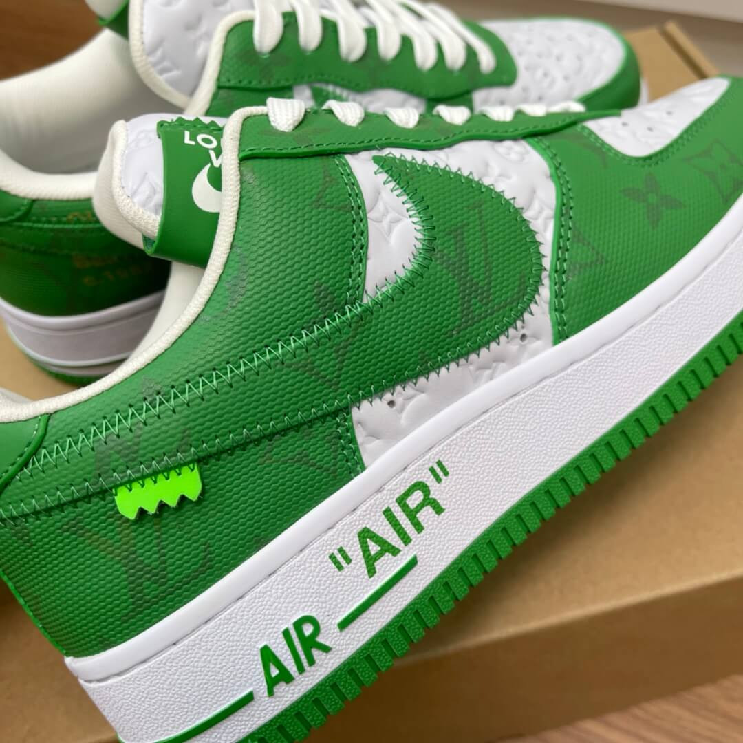 The Louis Vuitton x Nike Air Force 1 Low is a special collaboration between the storied high fashion house and Nike that was directed by the late Virgil Abloh. Produced by Louis Vuitton, Nike, and Abloh in 2022, this low-top sneaker features a two-tone colour block design, in green and white, that replicates the original Nike Dunk colourways from 1985. This highly sought-after collaboration features a white leather base with Louis Vuitton’s famous monogram print stamped into the material while a contrasting green textile with the Parisian fashion brand’s aforementioned pattern is found on the overlays and Swoosh. Signature details from Abloh’s previous collaborations with Nike under his Off-White clothing brand include a lime green hang tag on the sides, and printed 'AIR' branding alongside classic Air Force 1 'AIR' detailing on the lateral side of the midsole.