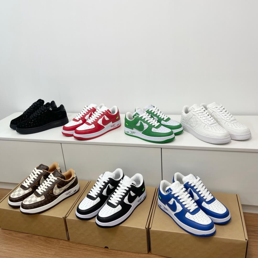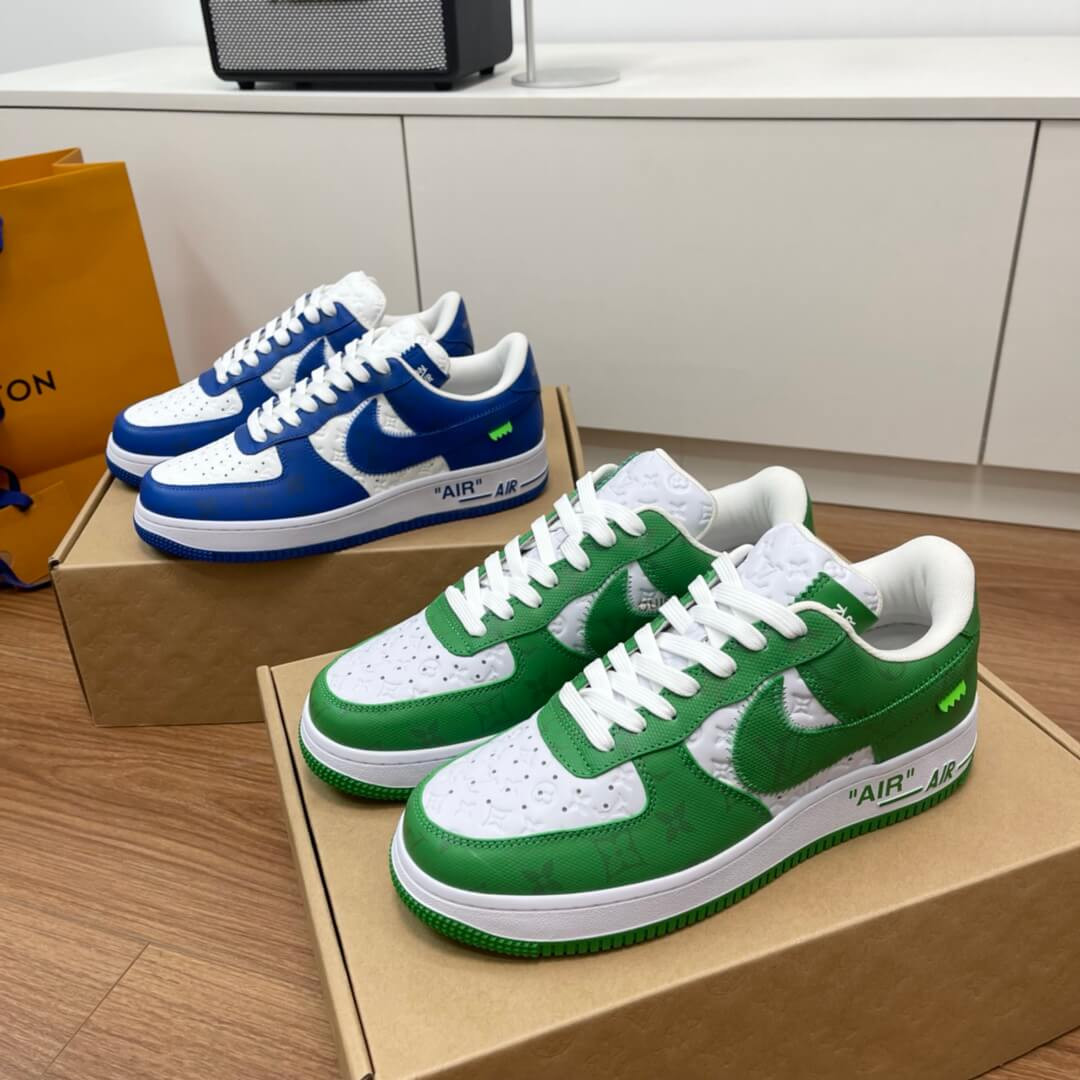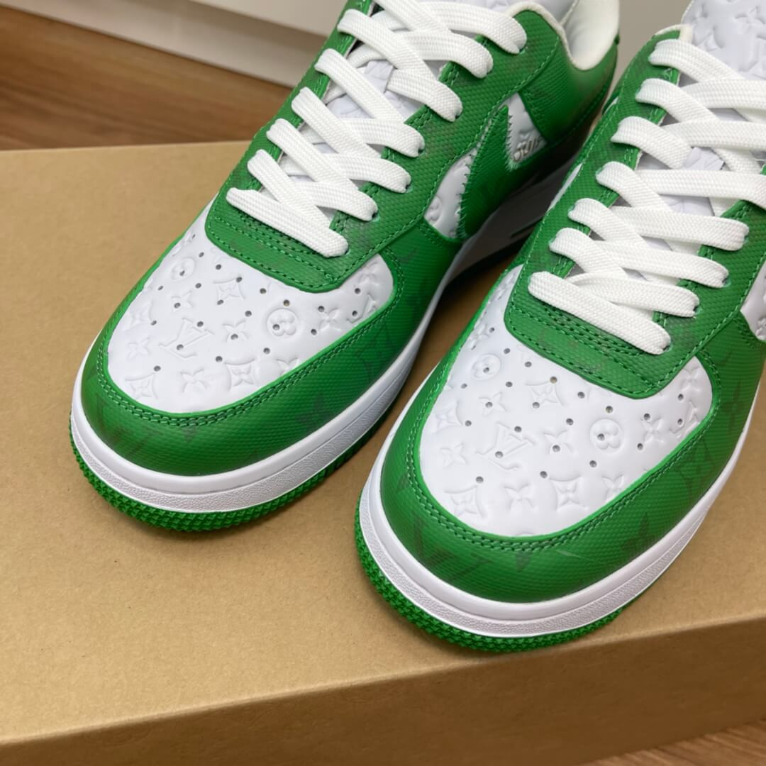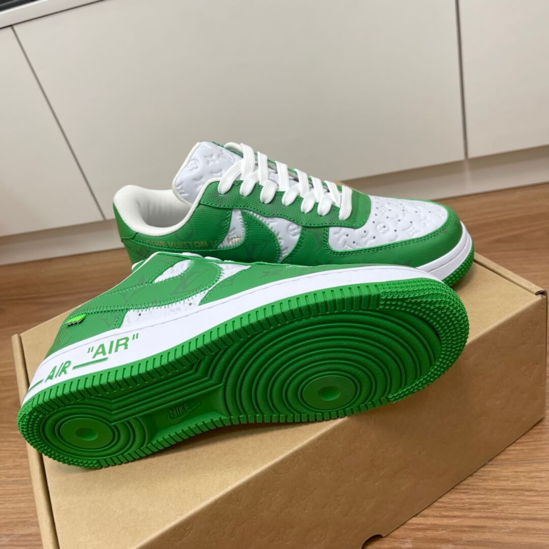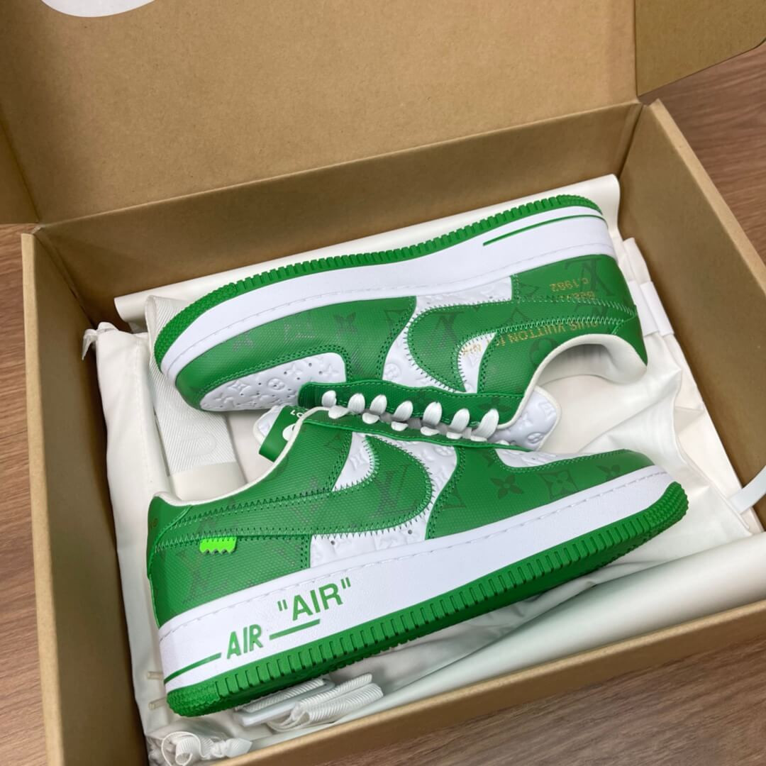 The Louis Vuitton x Nike Air Force 1 Low is a special collaboration between the storied high fashion house and Nike that was directed by the late Virgil Abloh. Produced by Louis Vuitton, Nike, and Abloh in 2022, this low-top sneaker features a two-tone colour block design, in green and white, that replicates the original Nike Dunk colourways from 1985. This highly sought-after collaboration features a white leather base with Louis Vuitton’s famous monogram print stamped into the material while a contrasting green textile with the Parisian fashion brand’s aforementioned pattern is found on the overlays and Swoosh. Signature details from Abloh’s previous collaborations with Nike under his Off-White clothing brand include a lime green hang tag on the sides, and printed 'AIR' branding alongside classic Air Force 1 'AIR' detailing on the lateral side of the midsole.