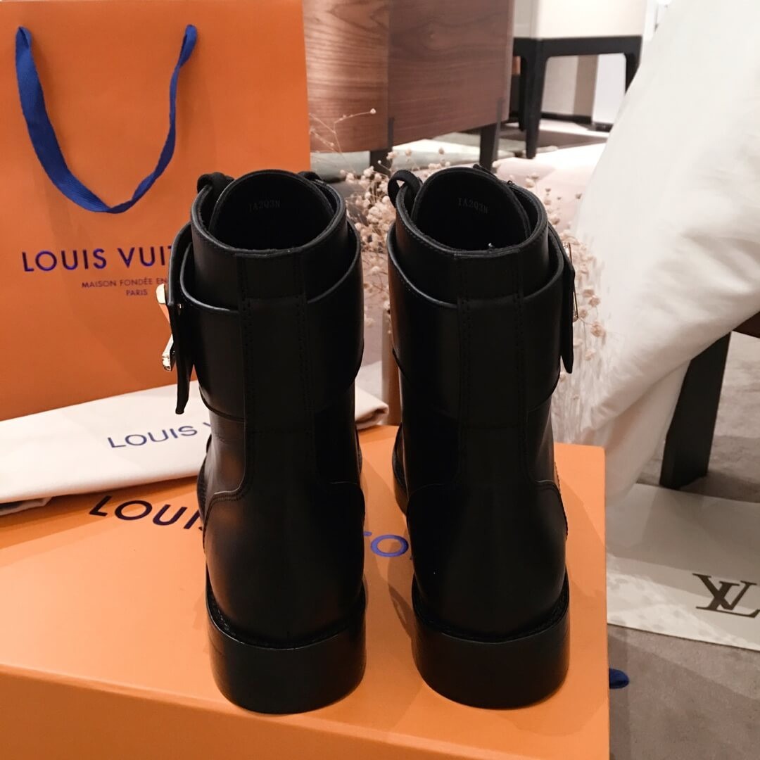 This on-trend ranger boot in plain calf leather is accessorized with an LV Twist buckle inspired by Louis Vuitton leather goods.