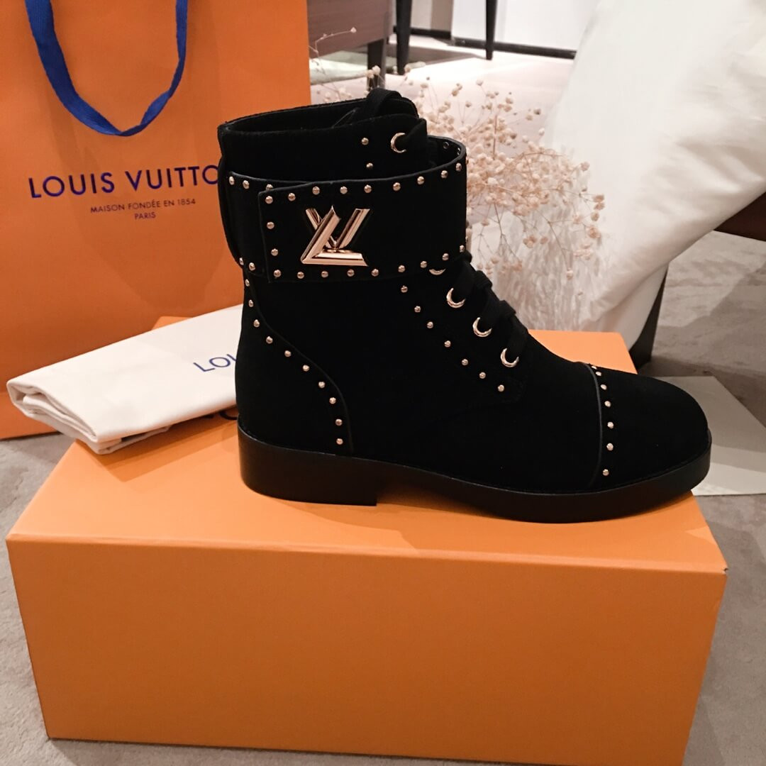 Louis Vuitton's on-trend Wonderland ranger boot is reinterpreted for the new season in velvety suede calf leather. It is given a precious touch by the gold-tone LV Twist accessory and the rows of tiny studs inspired by those used on the House's historic trunks.