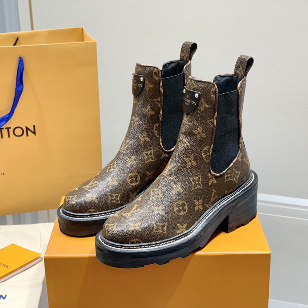 The LV Beaubourg ankle boot in patent Monogram canvas is a fashionable chunky style mixing masculine and feminine codes. The upper, which was inspired by the classic Chelsea boot, is combined with a sturdy yet lightweight outsole. This model is signed with a gold-embossed leather patch and an LV Initials stud in the heel.