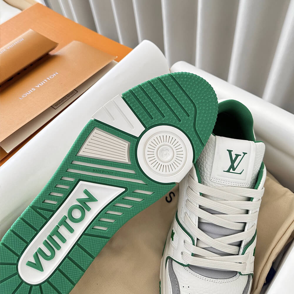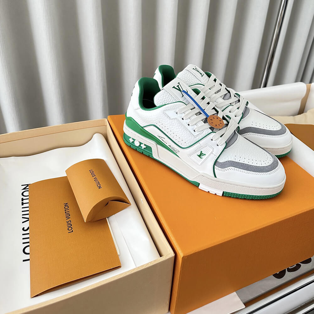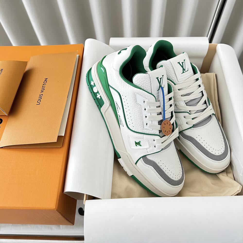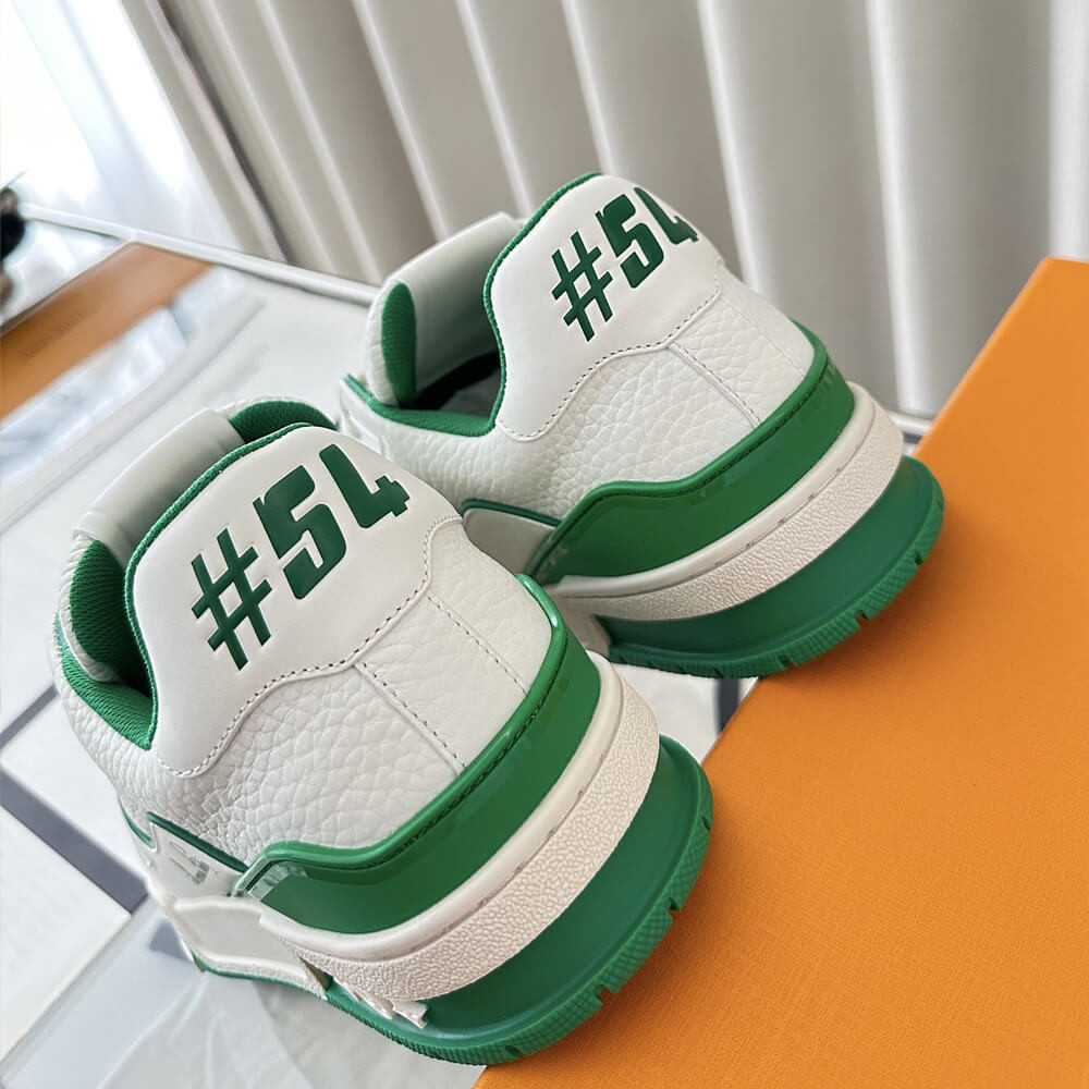 This version of the LV Trainer sneaker is crafted from grained calf leather in a bicolor palette evoking the basketball inspiration of Virgil Abloh's original design. This cult sneaker is notable for its elaborately constructed upper, which takes seven hours to stitch, and for its rich details, including the Louis Vuitton script signature on the side.