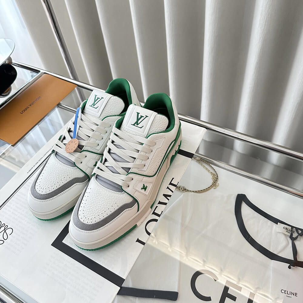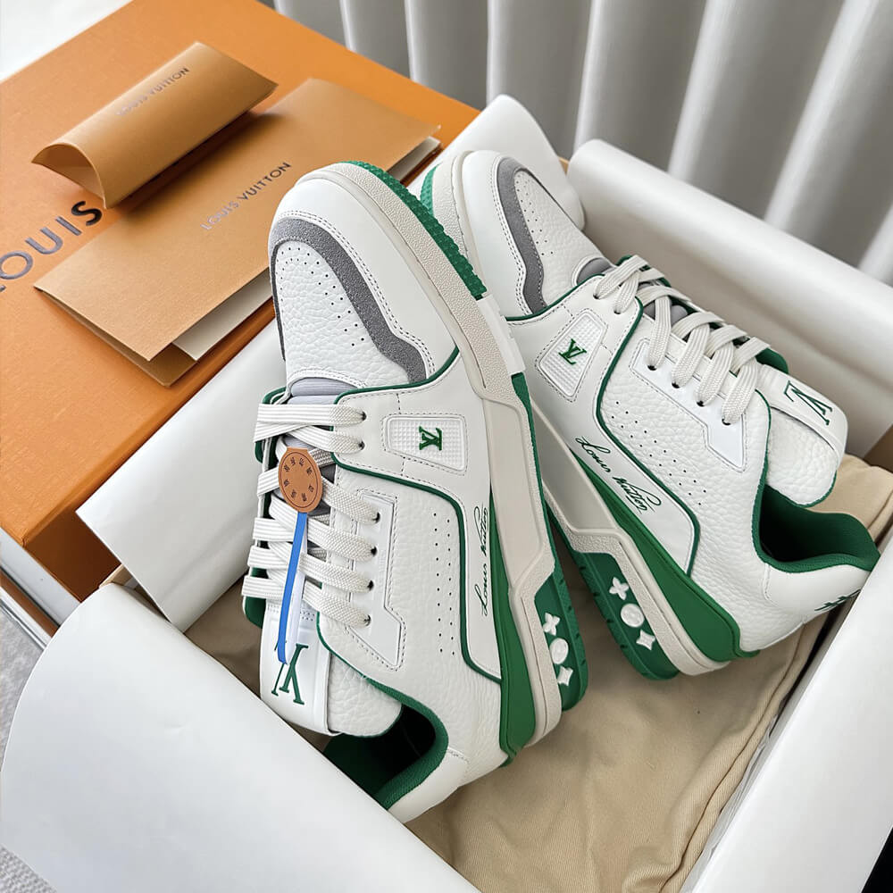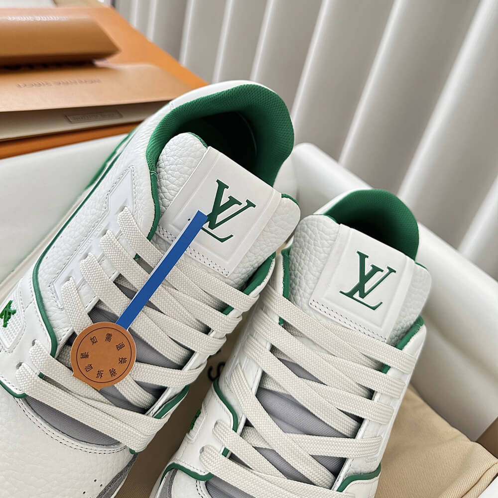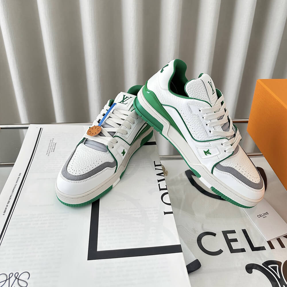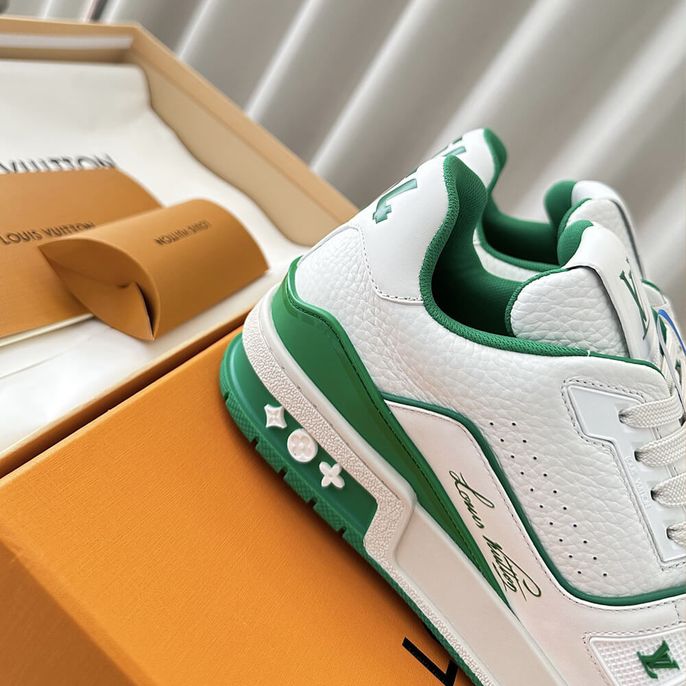 This version of the LV Trainer sneaker is crafted from grained calf leather in a bicolor palette evoking the basketball inspiration of Virgil Abloh's original design. This cult sneaker is notable for its elaborately constructed upper, which takes seven hours to stitch, and for its rich details, including the Louis Vuitton script signature on the side.