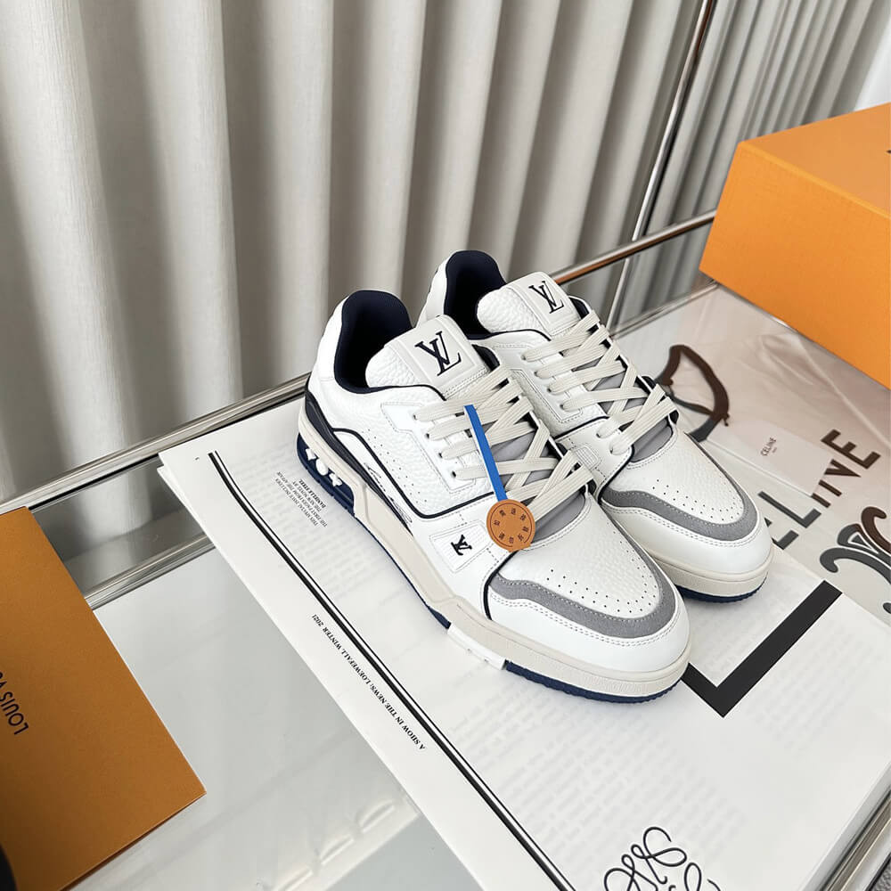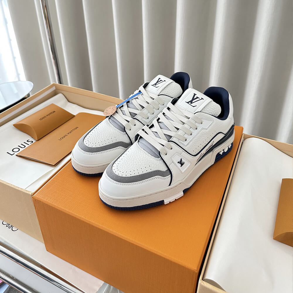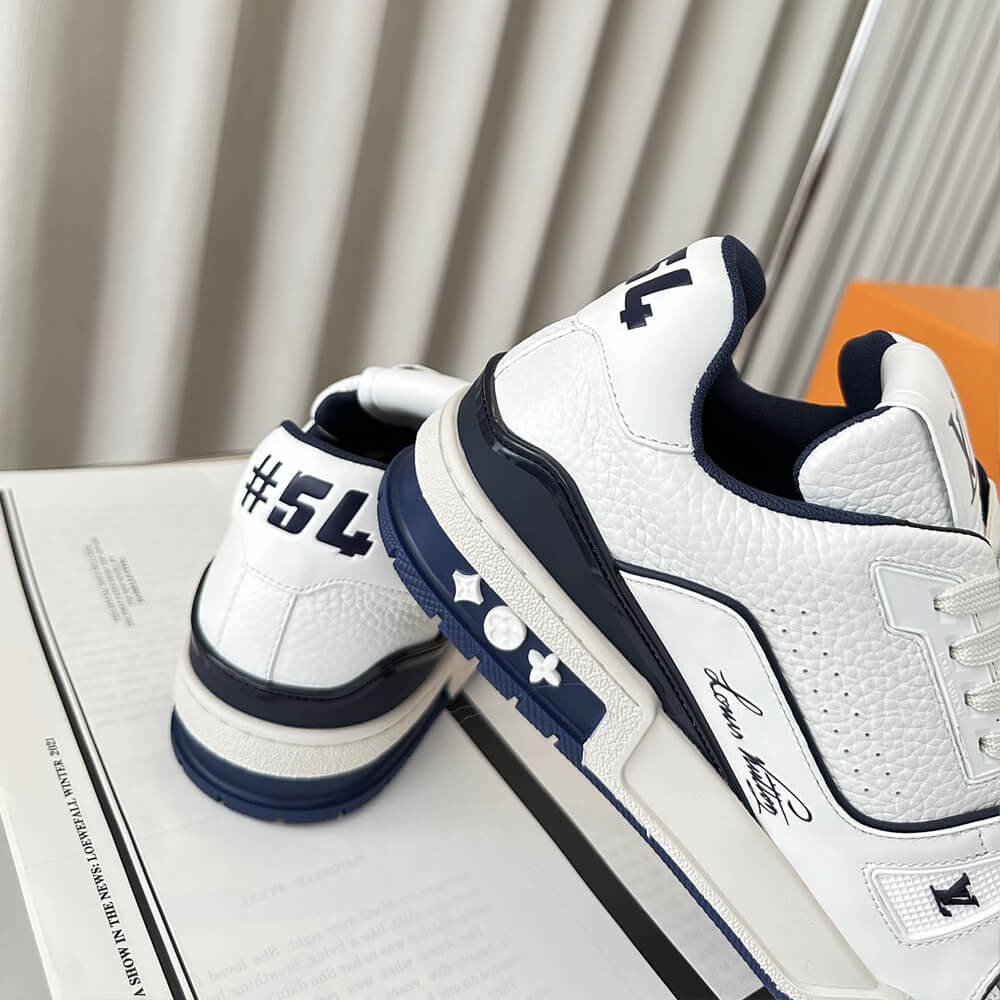 This version of the LV Trainer sneaker is crafted from grained calf leather in a bicolor palette evoking the basketball inspiration of Virgil Abloh's original design. This cult sneaker is notable for its elaborately constructed upper, which takes seven hours to stitch, and for its rich details, including the Louis Vuitton script signature on the side.