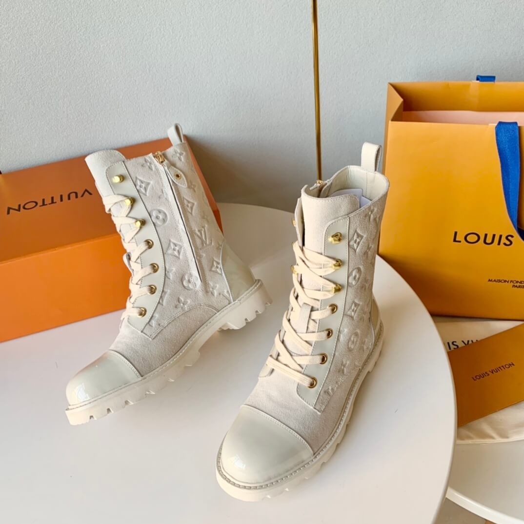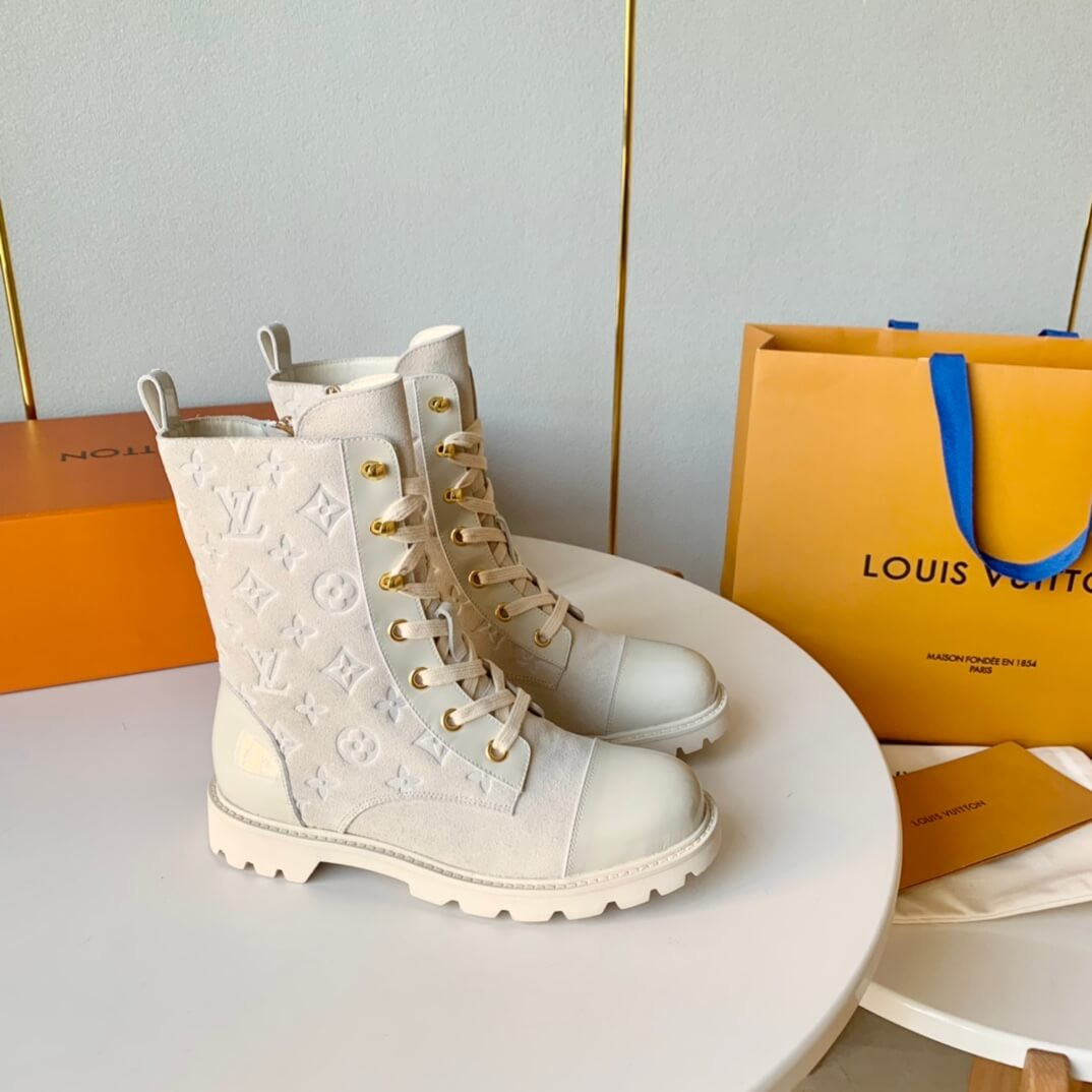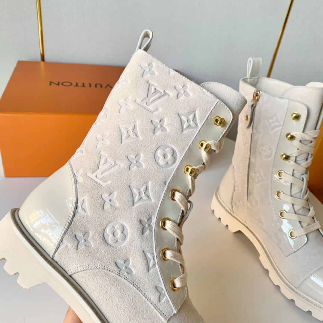 This wintry interpretation of the emblematic Territory flat ranger comes in suede calf leather debossed with the Monogram pattern. This military-inspired boot is notable for its refined details, including a toe cap in patent leather, and a lace accessory and eyelets in silver-tone metal. It is finished with a sturdy rubber outsole.
