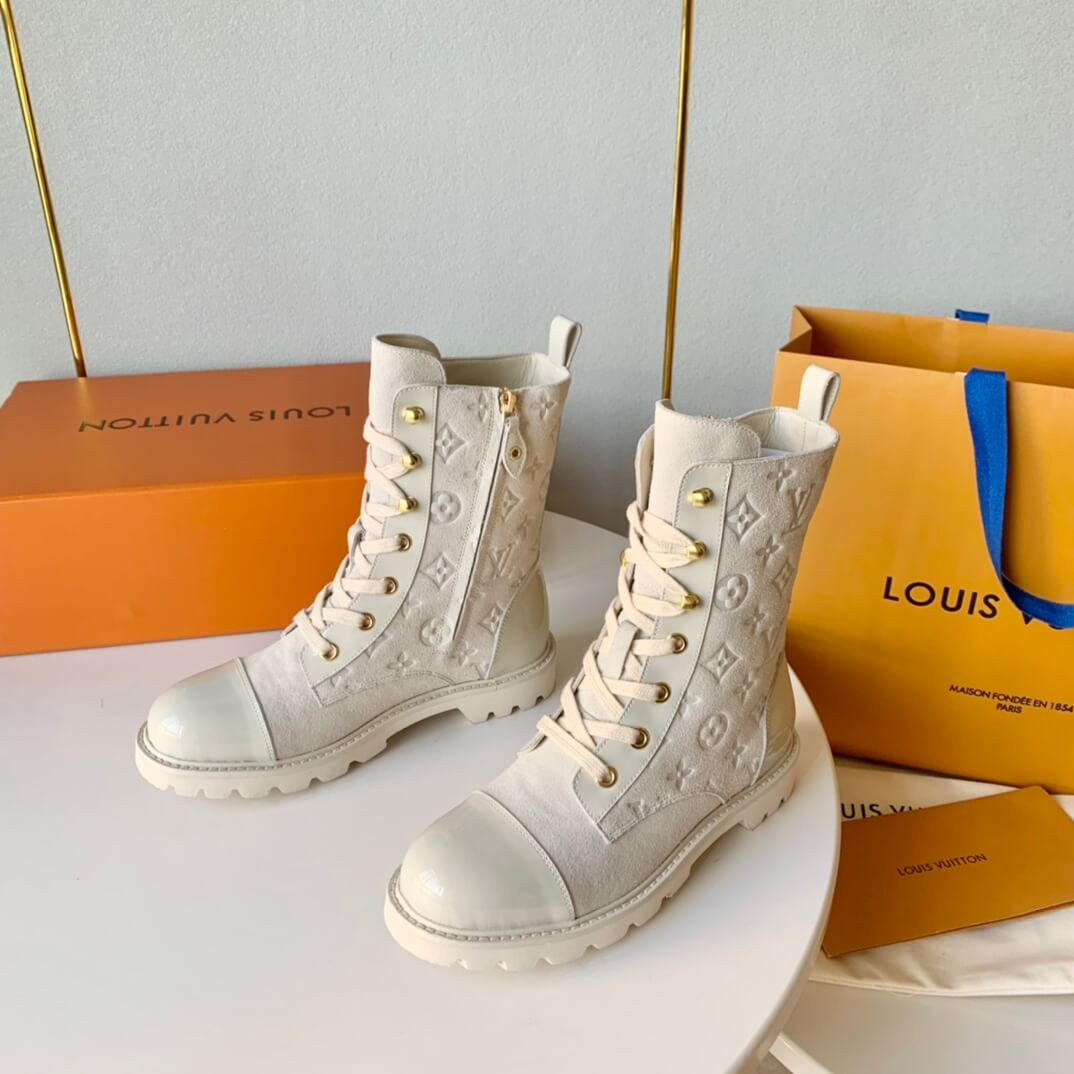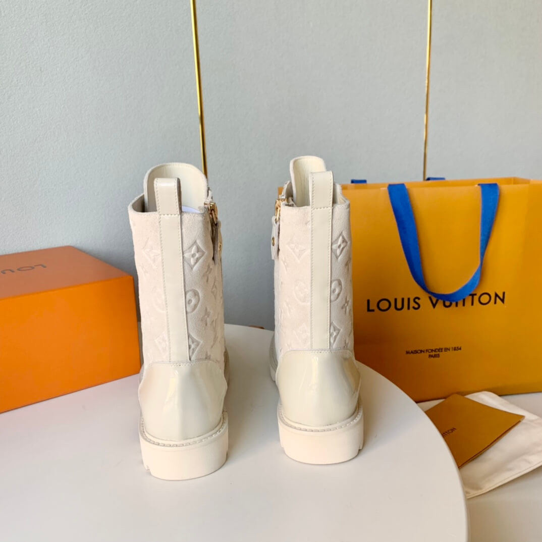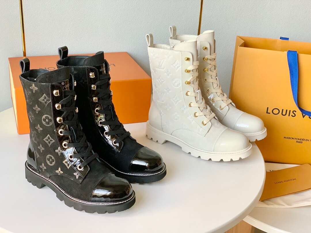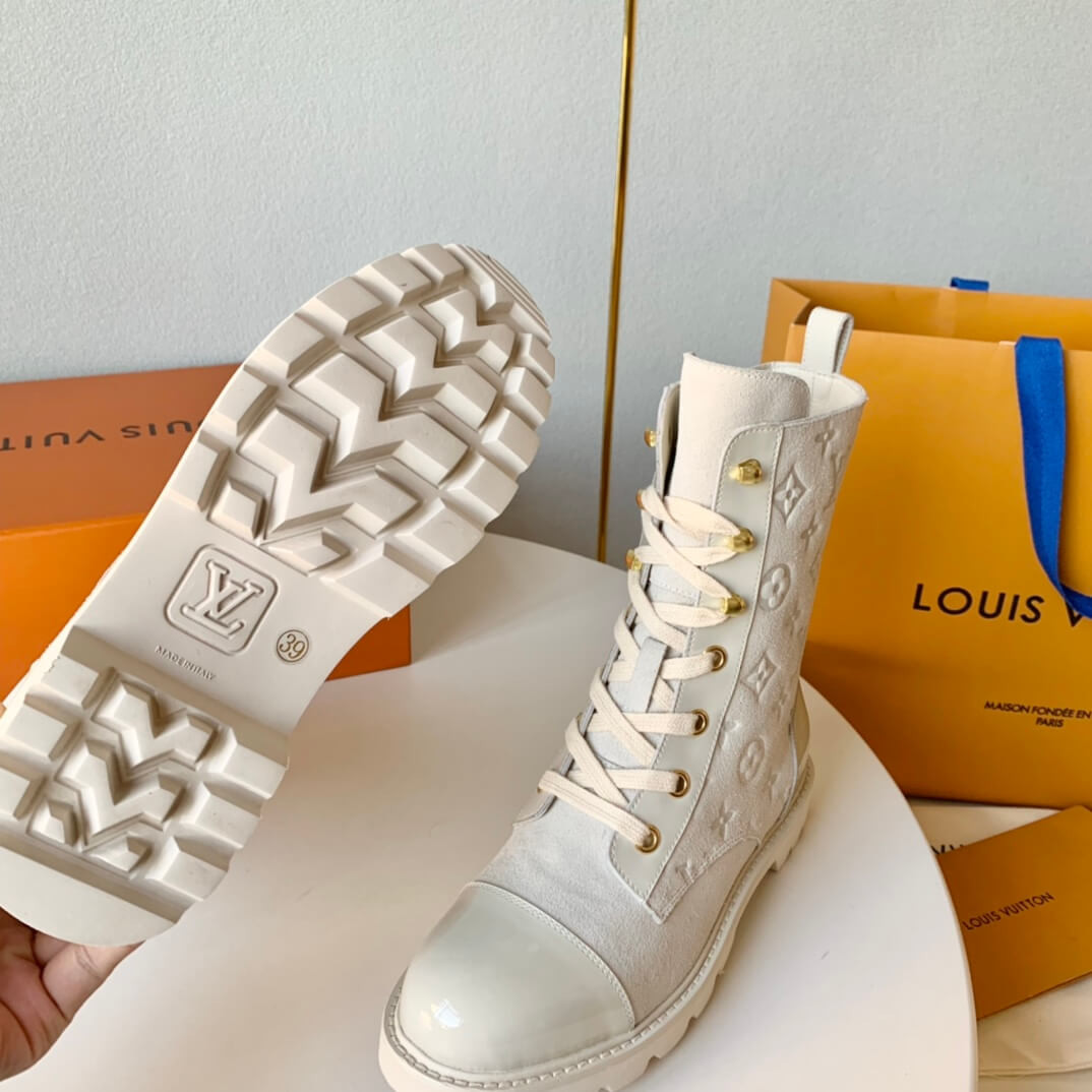 This wintry interpretation of the emblematic Territory flat ranger comes in suede calf leather debossed with the Monogram pattern. This military-inspired boot is notable for its refined details, including a toe cap in patent leather, and a lace accessory and eyelets in silver-tone metal. It is finished with a sturdy rubber outsole.
