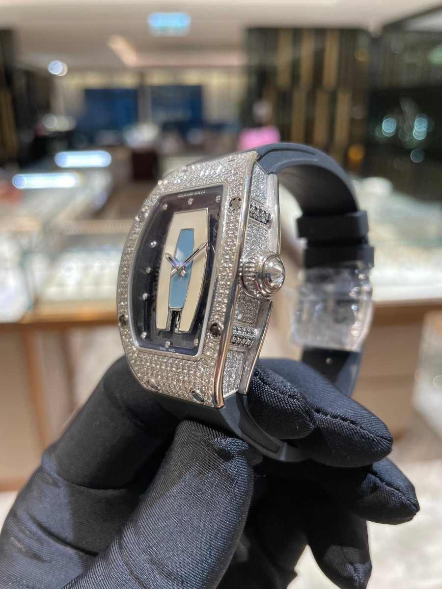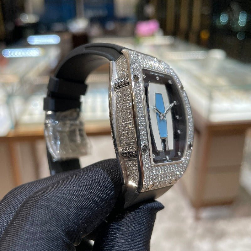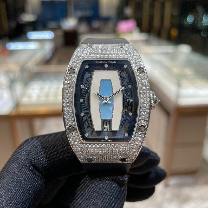 RM007 is a lady watch with a diamond white gold case. blue jasper dial and Automatic movement. It features Richard Mille's signature rotor in Grade 5 titanium. providing accurate timekeeping with hours. minutes. and a date display. Reliability and superior performance make this watch a leader in its field.