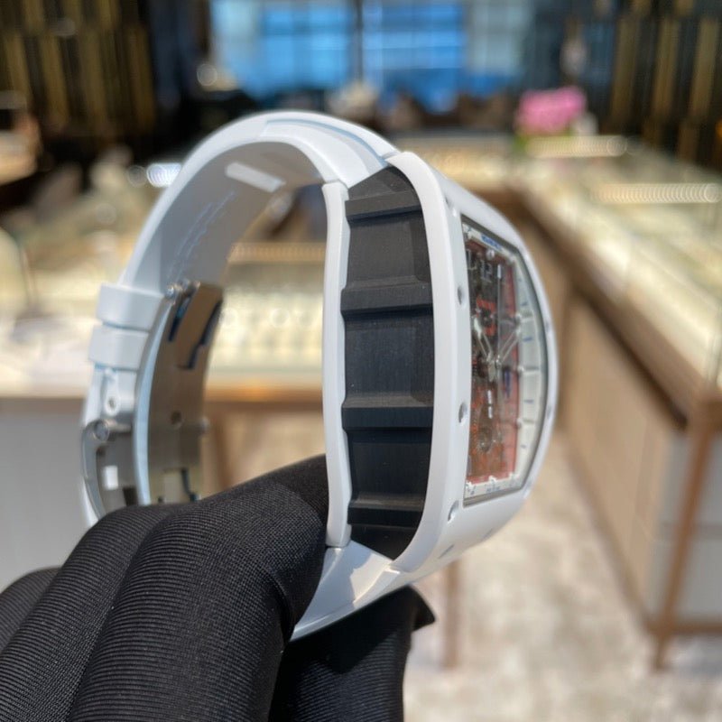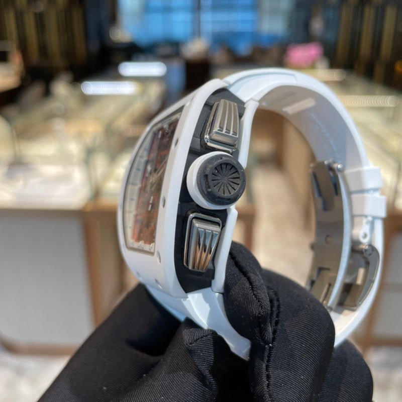 The RM011 Asia Exclusive is a limited edition piece from Richard Mille. Crafted with a white ceramic case and middle carbon TPT. The RM011 runs on the RMAC1 caliber which has automatic winding movement with adjustable rotor geometry. This luxury timepiece is an elegant expression of functionality and sophistication.