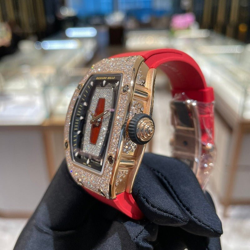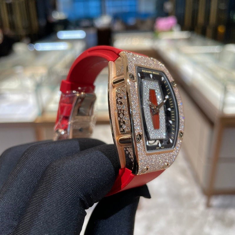 The Richard Mille RM07-01 is crafted from rose gold and set with a diamond-encrusted snow setting. Its inner jasper stone dial offers a magnificent contrast of colors and textures. beautifully complementing the luxury of the case design.