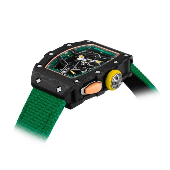 Richard Mille RM07-04 Black Ester Ledecká: a sleek and lightweight sport watch with a carbon black TPT case and an inner bezel of green color. This is the first model of the RM Ladies collection. designed for superior performance. Make a bold statement with this stylish and sophisticated watch.