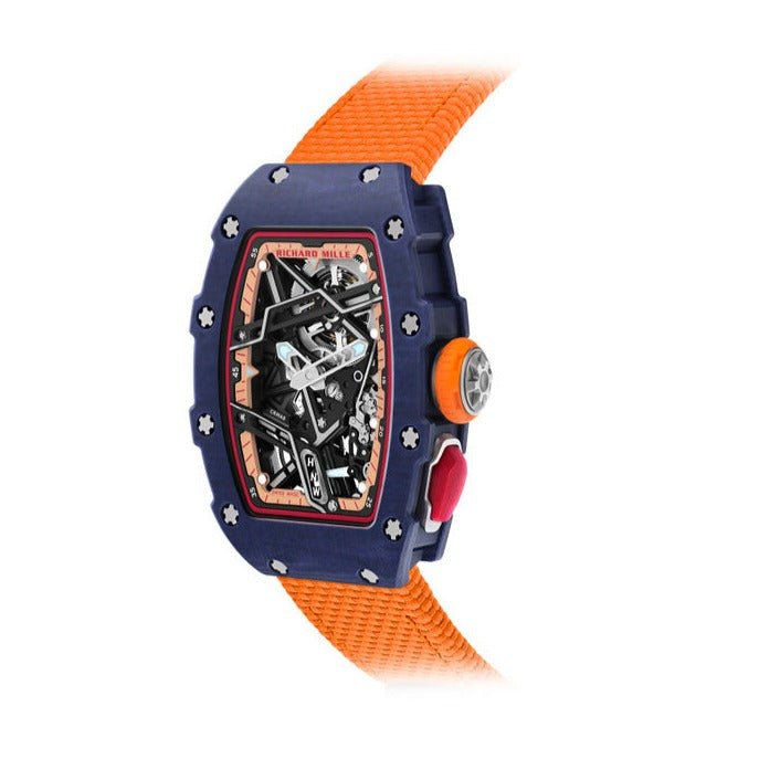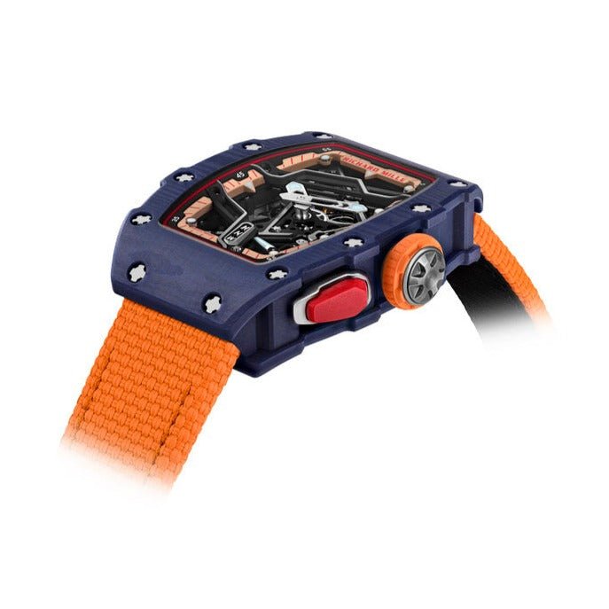This Richard Mille RM07-04 Blue Margot Laffite watch is crafted with a purple carbon TPT case. The inner bezel. crown and strap are all in an eye-catching orange colour. Not only is this watch extremely beautiful. but it is also the lightest and most sporty watch for ladies on the market.