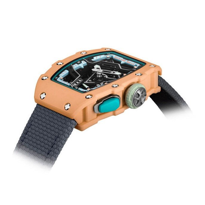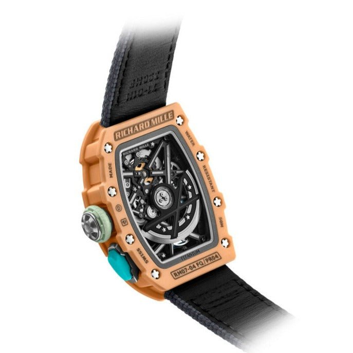 The Richard Mille RM07-04 Aurora Straus is the perfect marriage of style and substance. Crafted from Carbon TPT in a unique salmon pink colour. with an inner bezel and strap in grey. this is the first ladies sport model in the Richard Mille collection. This stunning watch is sure to be a conversation starter.