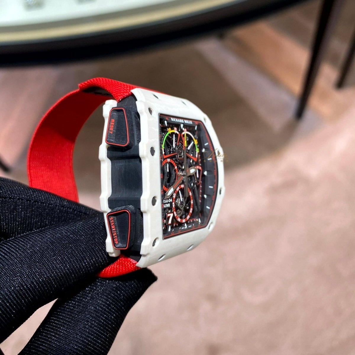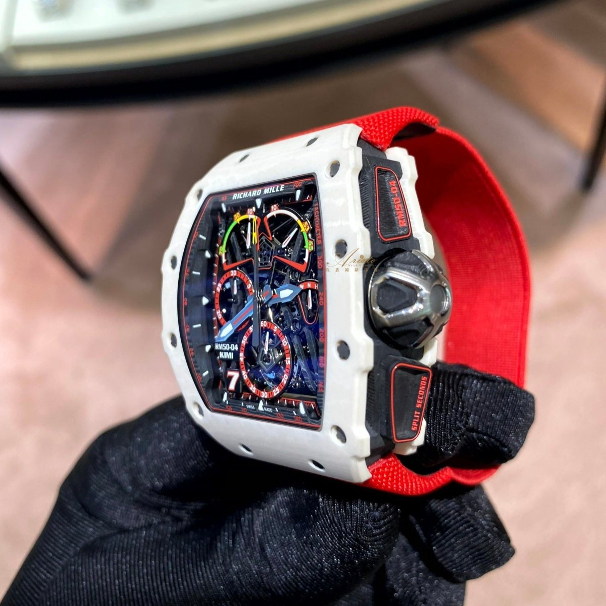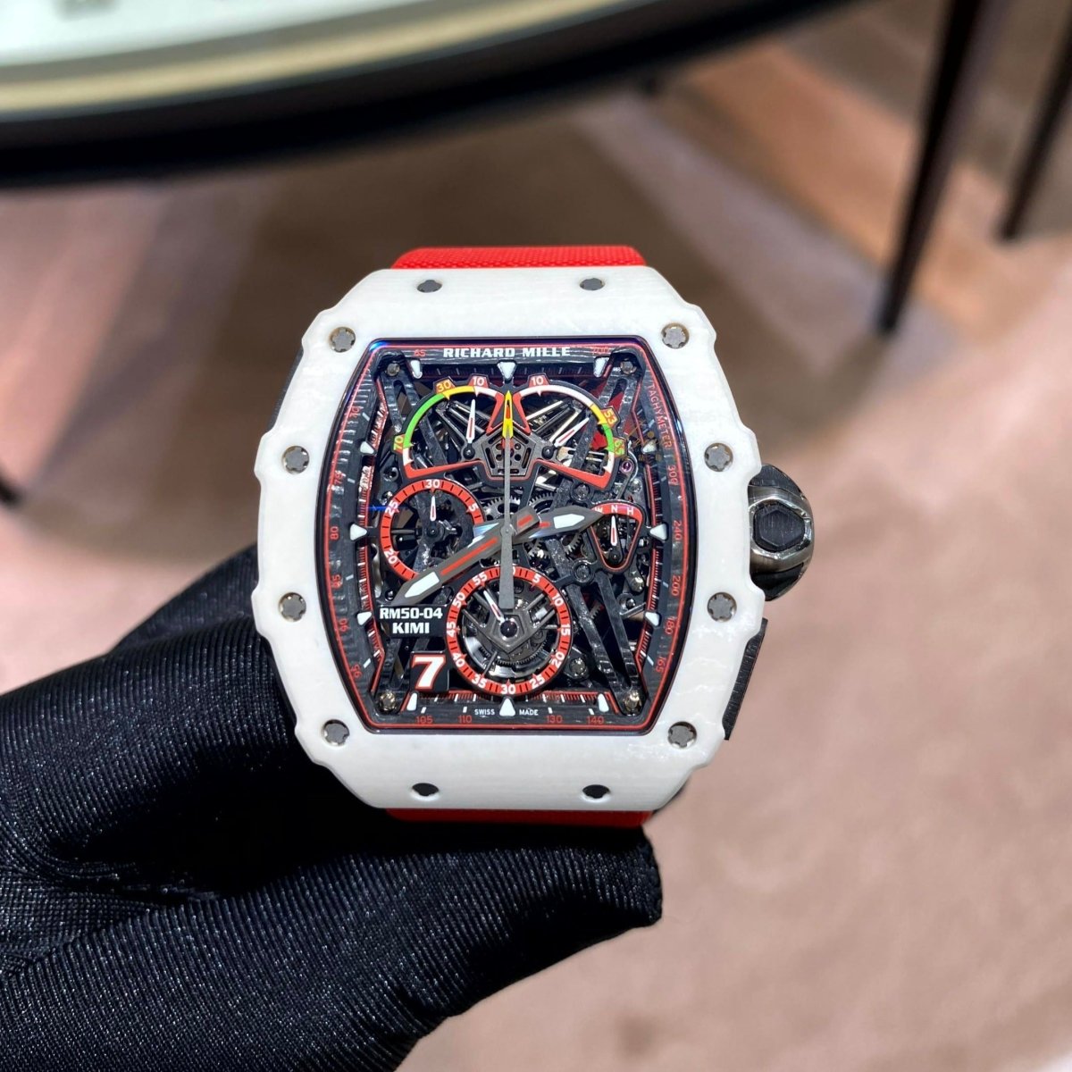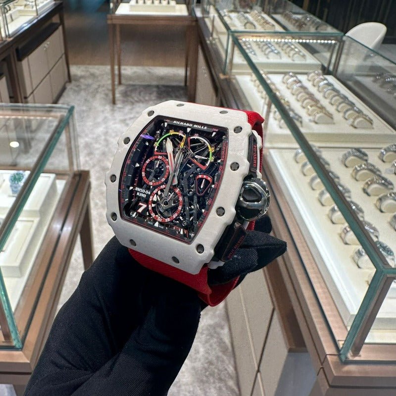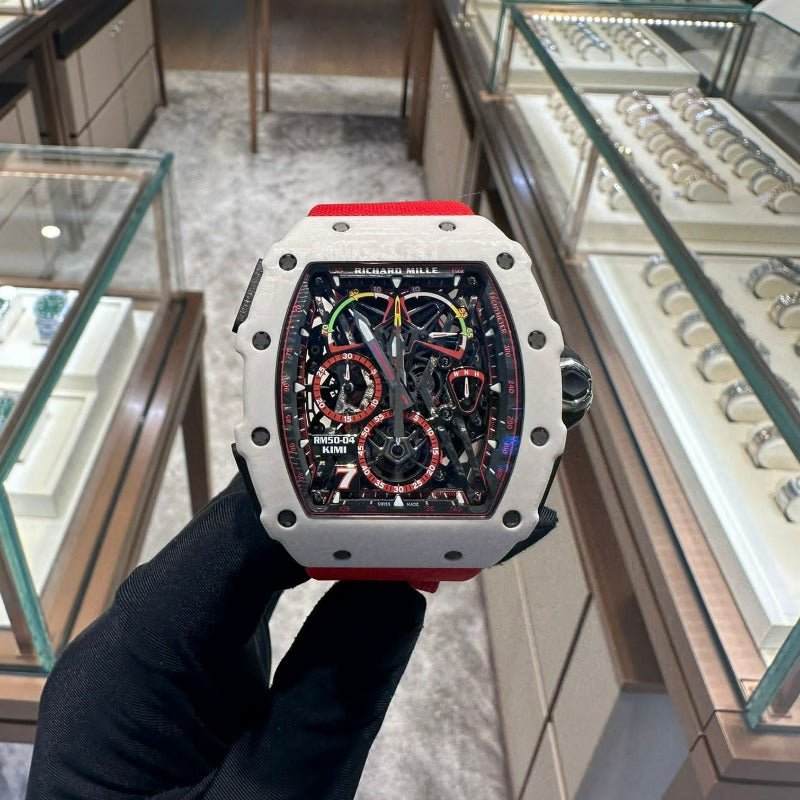 The RM50-04 Kimi is a special edition of 30 pieces. featuring the calibre RM50-03. a manual winding tourbillon movement with chronograph and 30-minute totaliser. Adorned with power-reserve. torque and function indicators.