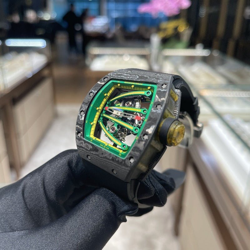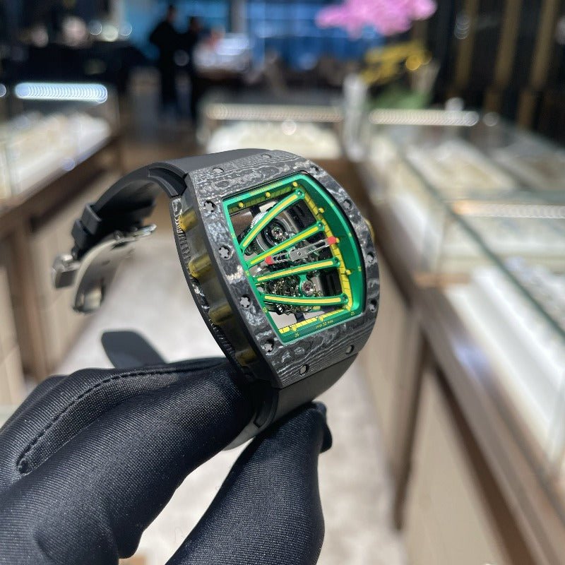 RM59-01 NTPT offers a unusual tonneau shaped design crafted from Richard Mille's signature Carbon TPT. As worn by athlete Yohan Blake. this watch is equipped with a manual winding tourbillon movement. providing accuracy and precision. Its skeletonized structure provides a clear view of the intricate movement. colour comes from Jamaican flag.