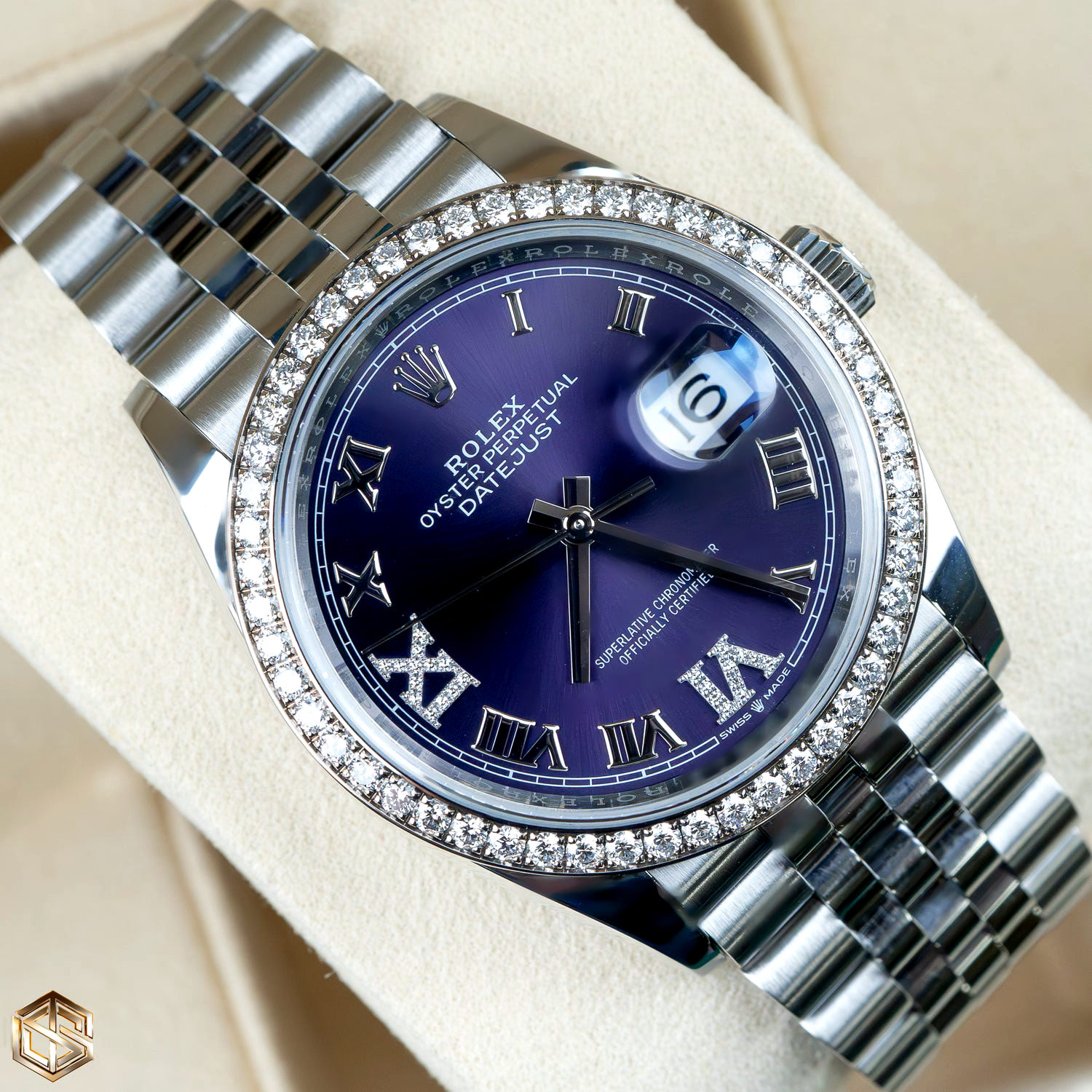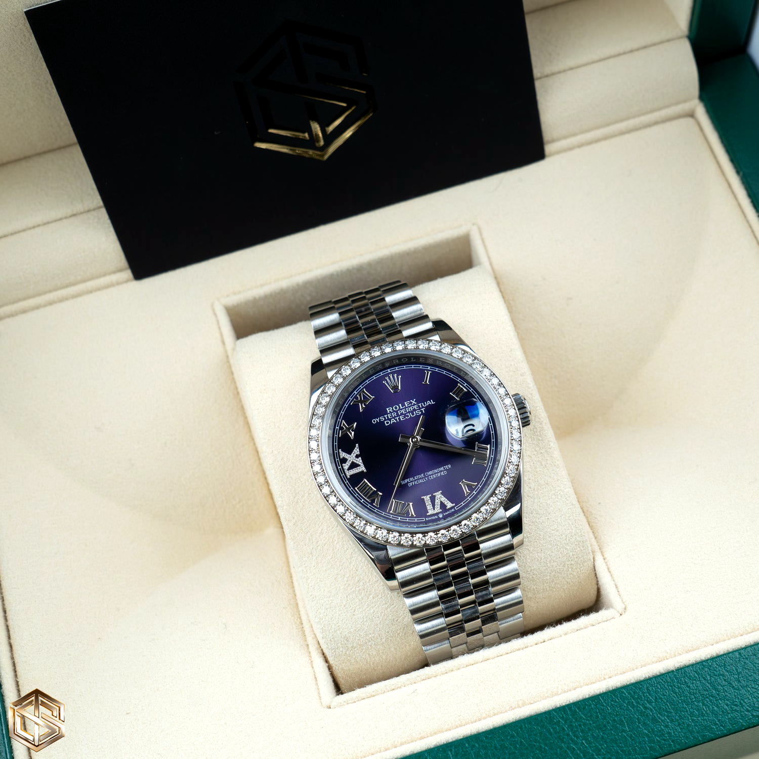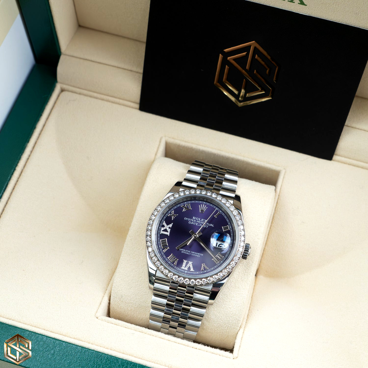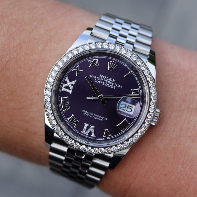 THIS OYSTER PERPETUAL DATEJUST 36 IN OYSTERSTEEL AND SILVER FEATURES AN PURPLE, DIAMOND-SET DIAL AND A JUBILEE BRACELET.
