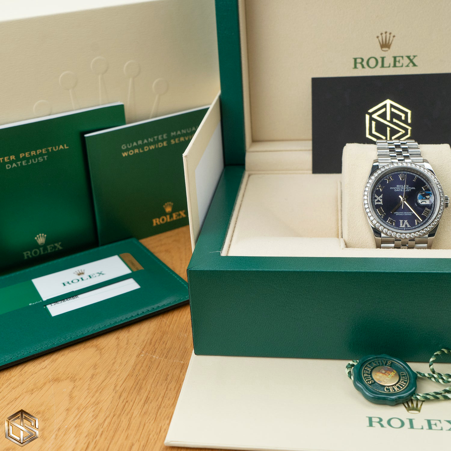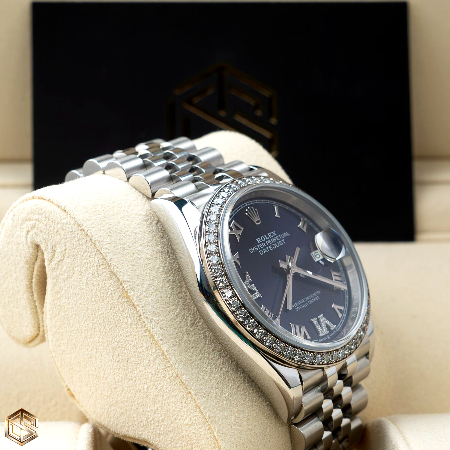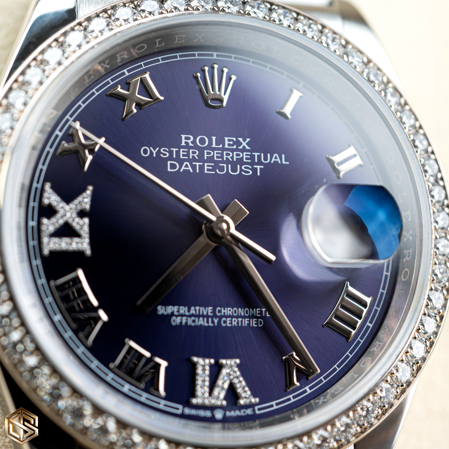 Its dial features a Roman VI and IX in 18 ct gold, set with 24 diamonds. The light reflections on the case sides and lugs highlight the elegant profile of the 36 mm Oyster case, which is fitted with a diamond-set bezel. Aesthetically, the Datejust has spanned eras, while retaining the enduring codes that make it, notably in its traditional versions, one of the most recognized and recognizable of watches.