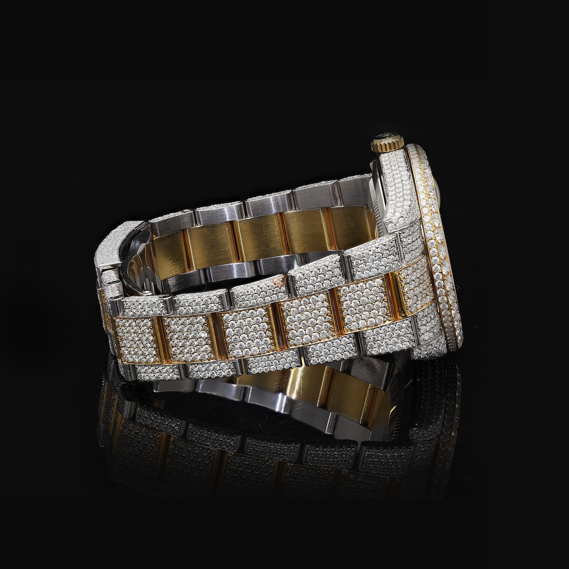 We use Rhinestone or Zircon for our iced out watches, and all our diamond watches feature high-quality movement with a super clone standard. If you prefer real moissanite, the watch will cost $3000-4000 and will pass testing with cert.