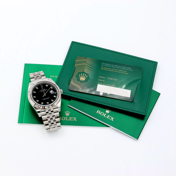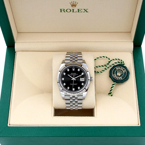 41mm white Rolesor case comprised of a 904L steel monobloc middle case, screw-down steel back, screw-down crown with twin lock double waterproofness system, 18K white gold fluted bezel, scratch-resistant double anti-reflective sapphire crystal with cyclops lens over the date, dark rhodium dial, 10 diamond hour markers, Rolex calibre 3235 perpetual self-winding movement with date at 3 o'clock that changes instantaneously at midnight in a few thousandths of a second, approximately 70 hours of power reserve, 904L steel Oyster bracelet with three-piece links, folding Oysterclasp buckle with Easylink 5mm comfort extension link. Waterproof to 100 meters.
