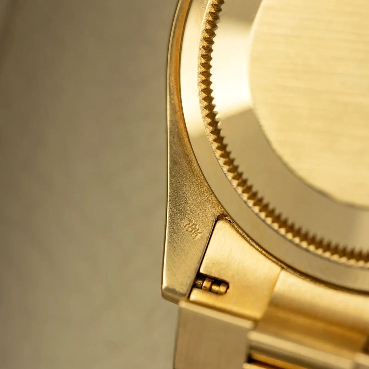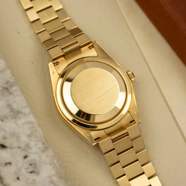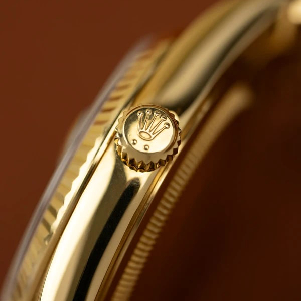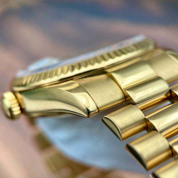 The Rolex fluted bezel is a mark of distinction. Originally, the fluting of the Oyster bezel had a functional purpose: it served to screw the bezel onto the case helping to ensure the waterproofness of the watch. It was therefore identical to the fluting on the case back, which was also screwed onto the case for waterproofness, using specific Rolex tools. Over time, the fluting became an aesthetic element, a genuine Rolex signature feature. Today the fluted bezel is a mark of distinction, in gold on this Day-Date 40.