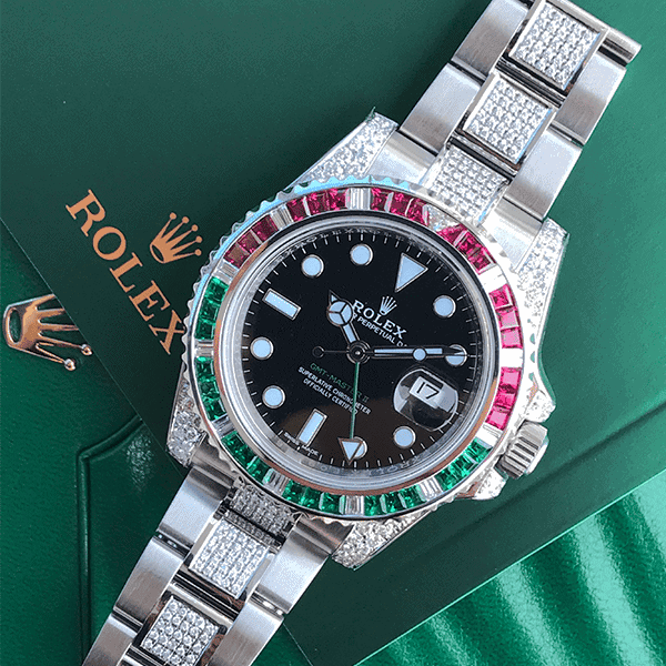• Rolex GMT Master 2 Iced Lugs Sapphire Diamond Ruby Bezel 126755SARU