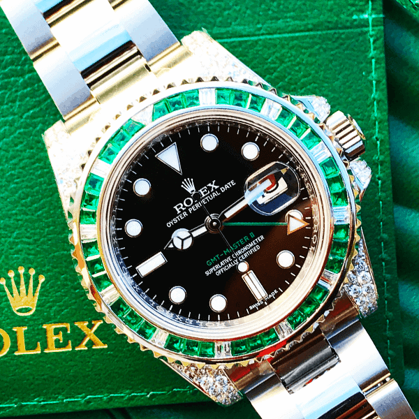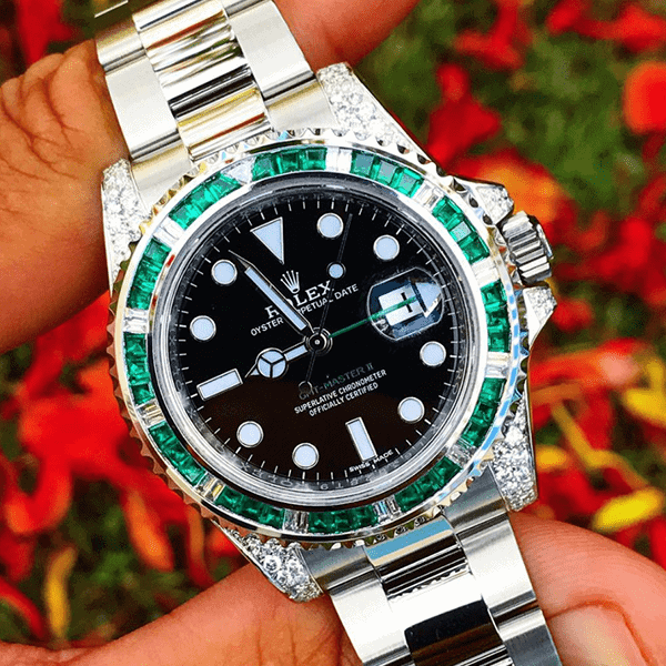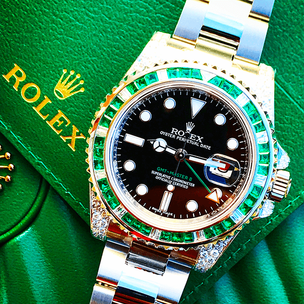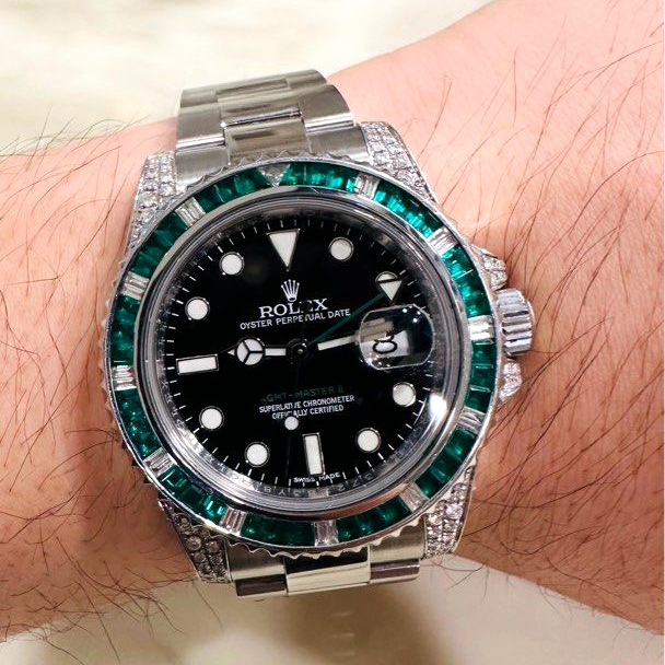 • Rolex GMT Master 2 Iced Lugs Sapphire Diamond Ruby Bezel 126755SARU