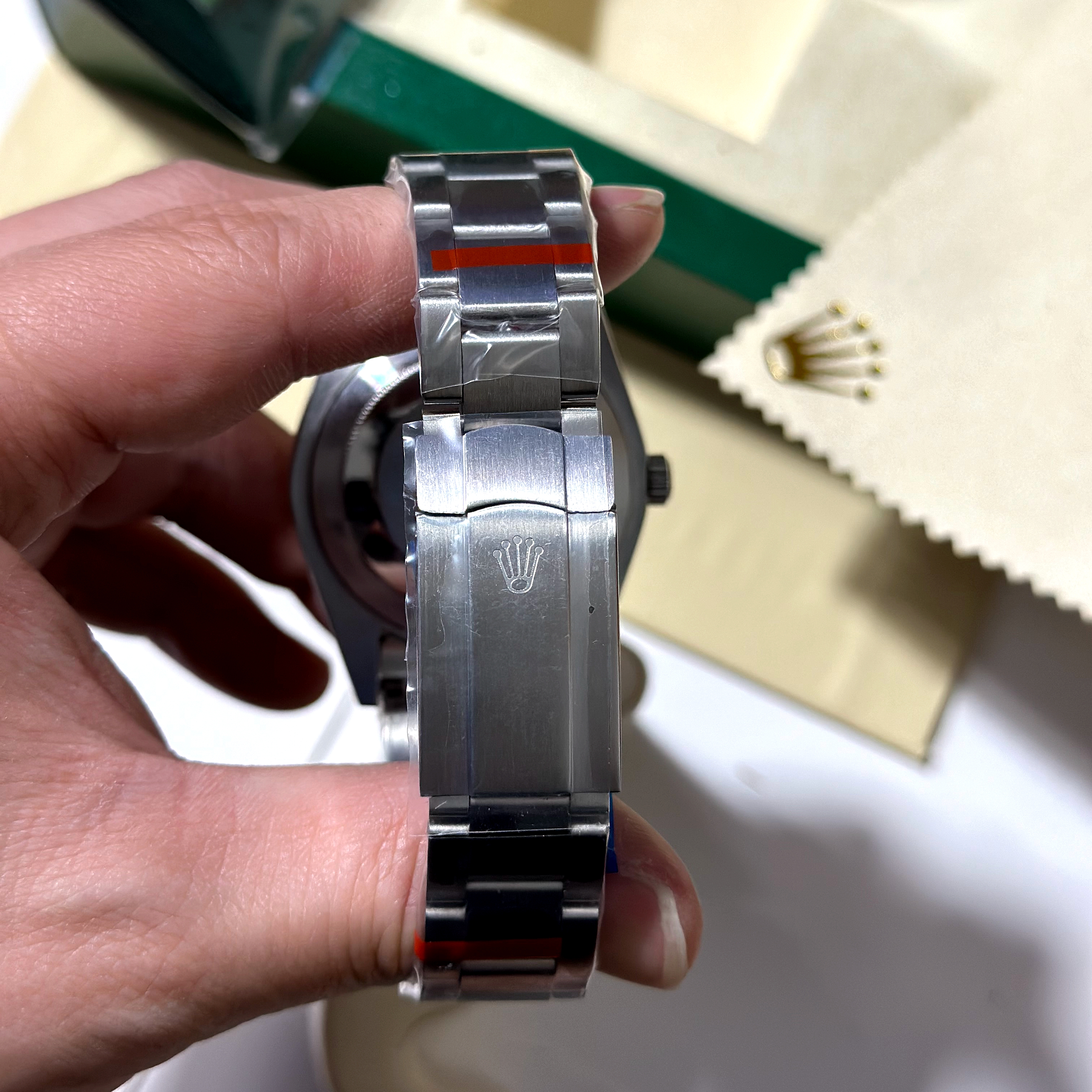 Rolex Perpetual Oyster Perpetual 41 Watch of Stainless Steel. Dark rhodium dial with index hour markers. Screw-down solid crown with twin lock double waterproofness system. Scratch-resistant sapphire crystal. The watch has a central hour, minute and second hands. Stop-seconds for precise time setting. The Stainless Steel Domed bezel. The Watch comes with Mechanical Self-winding Movement & 3132 Caliber w/ 31 jewels & 48hours power reserve. The Stainless Steel Oyster bracelet with flat three-piece links, folding Oysterclasp buckle. The Watch is with Rolex Watch box, Rolex Warranty Card. Covered with Rolex Warranty.
