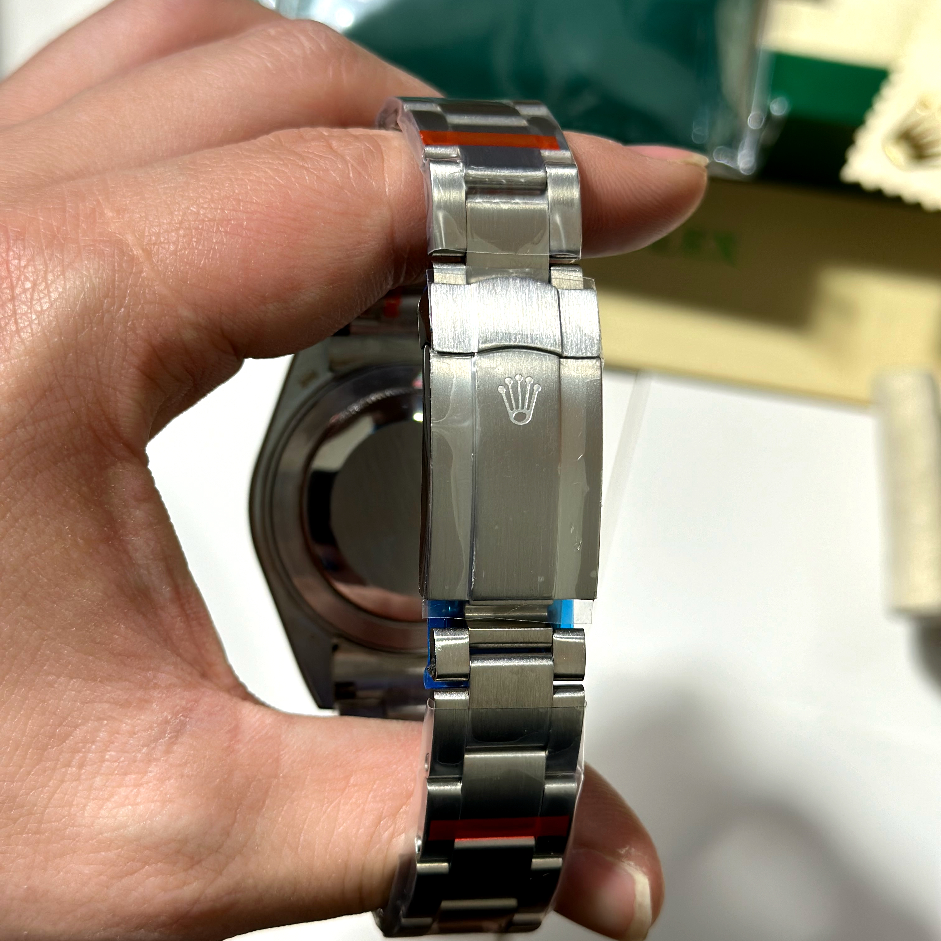 Rolex Perpetual Oyster Perpetual 41 Watch of Stainless Steel. Dark rhodium dial with index hour markers. Screw-down solid crown with twin lock double waterproofness system. Scratch-resistant sapphire crystal. The watch has a central hour, minute and second hands. Stop-seconds for precise time setting. The Stainless Steel Domed bezel. The Watch comes with Mechanical Self-winding Movement & 3132 Caliber w/ 31 jewels & 48hours power reserve. The Stainless Steel Oyster bracelet with flat three-piece links, folding Oysterclasp buckle. The Watch is with Rolex Watch box, Rolex Warranty Card. Covered with Rolex Warranty.