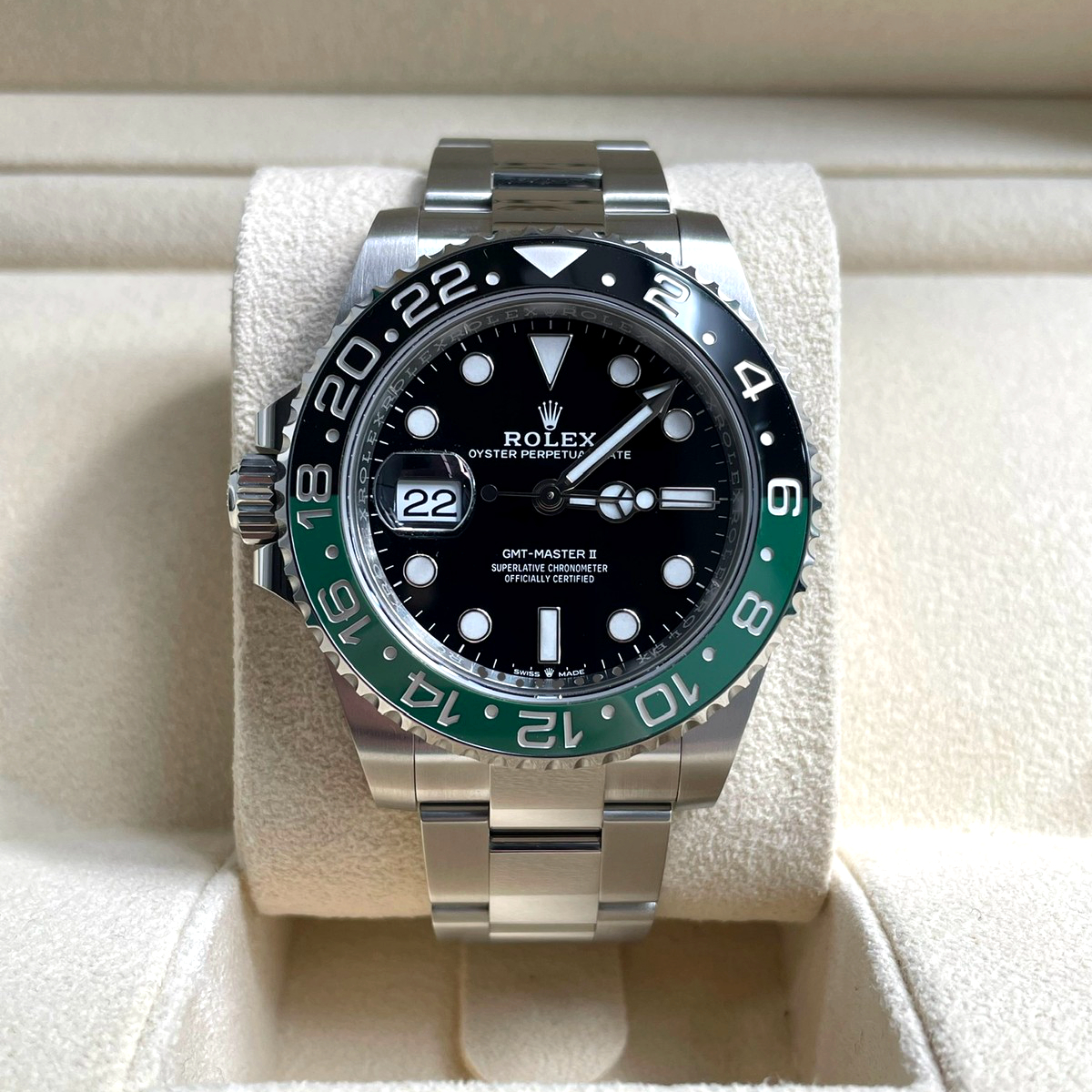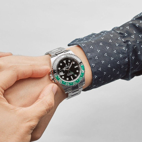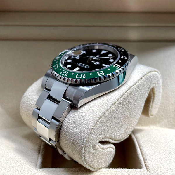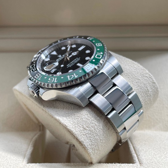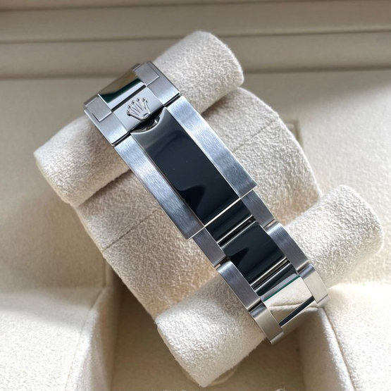 The case is stainless steel with brushed lugs and high-polish finished sides. The bezel is steel with a black and green 24-hour ceramic insert. Stainless steel left sided crown and case back are screw-down to keep the watch water-resistant. It features an oyster bracelet where links are polished down the middle and brushed on either side.