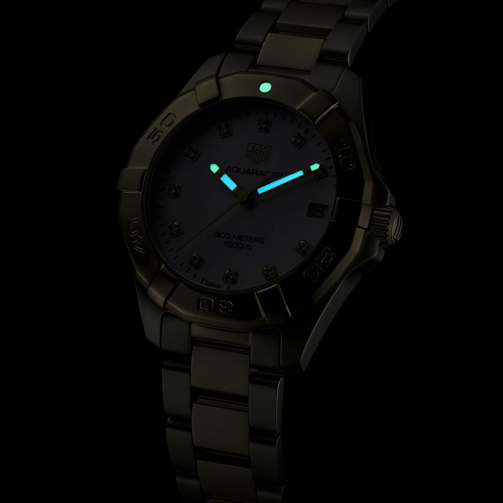 A quartz watch features a mother-of-pearl dial and a steel bracelet with a 60-minute scale. unidirectional turning bezel. and a screw-down crown. all plated in 18ct 2N gold. Eleven indexes are accented with 0.11 CT of diamonds for added shimmer.