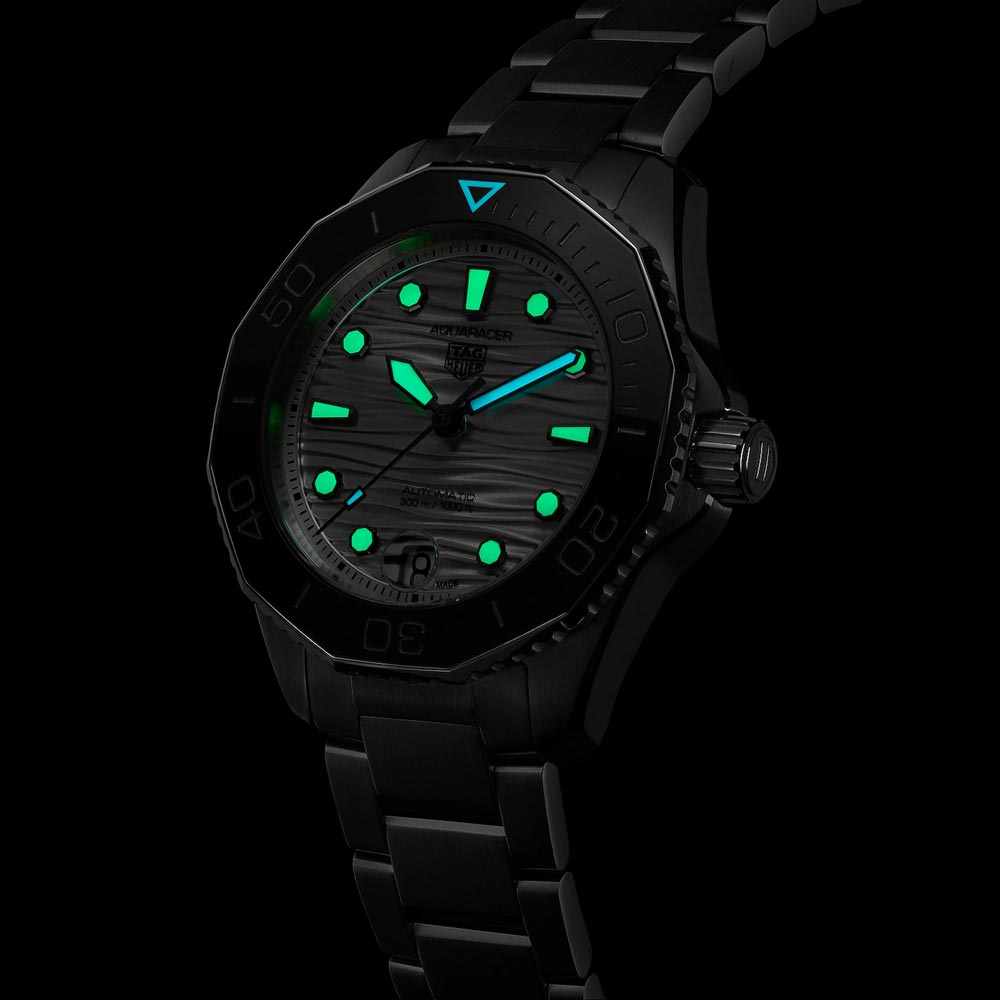 This 36mm TAG Heuer Aquaracer is the ideal choice for diving excursions. featuring a silver-lacquered dial and bold black gold-plated hands and markers with white Super-LumiNova® for assured readability both during the day and nighttime.