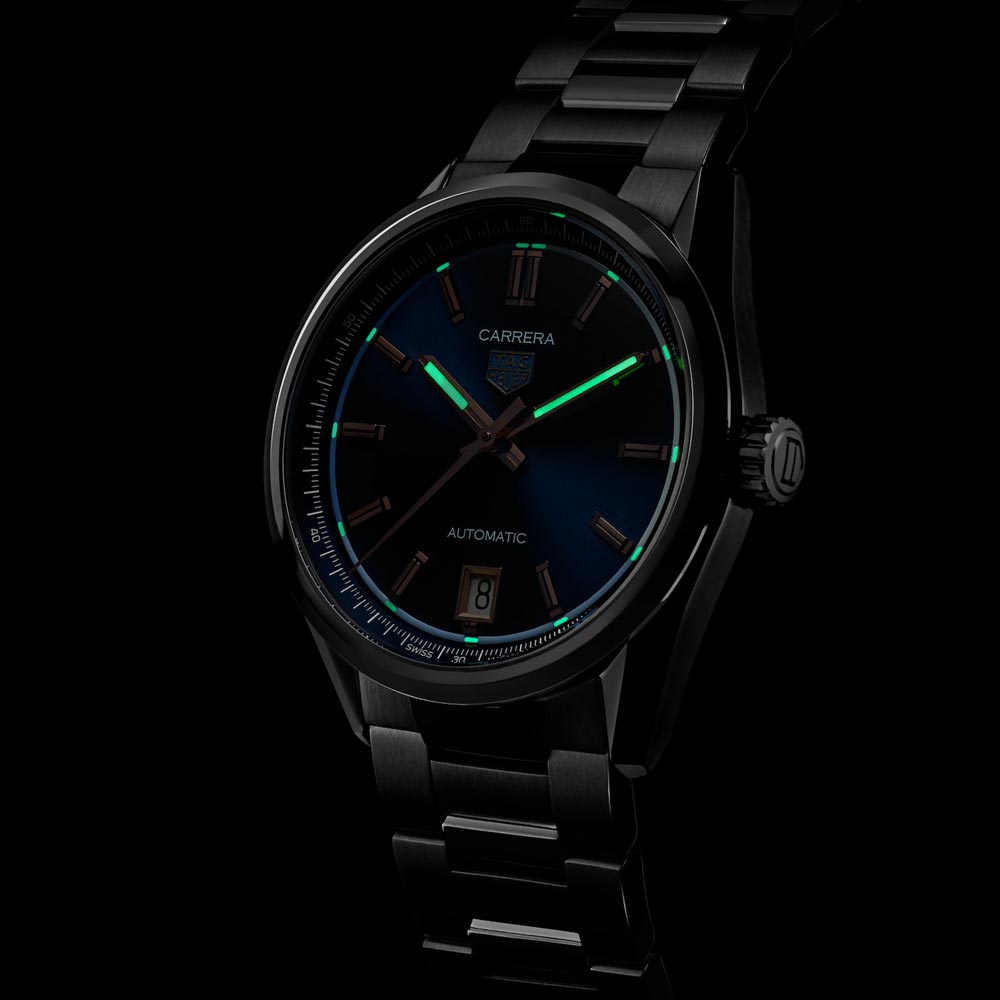 This TAG Heuer Carrera exudes iconic allure with its deep-blue sunray brushed dial and 18ct 5N rose gold-plated applied hands and indexes. resolutely pushing forward with the Calibre 7 movement.