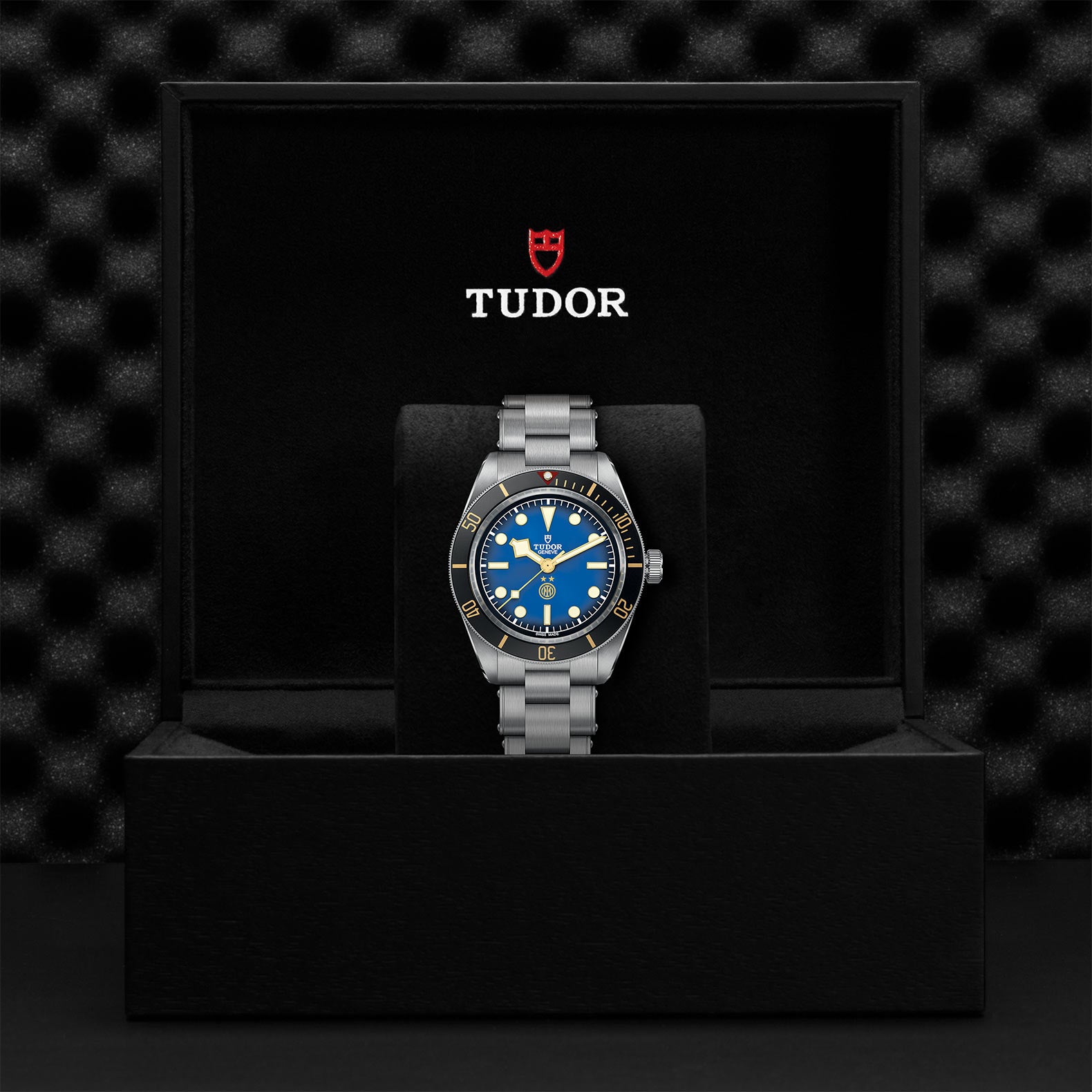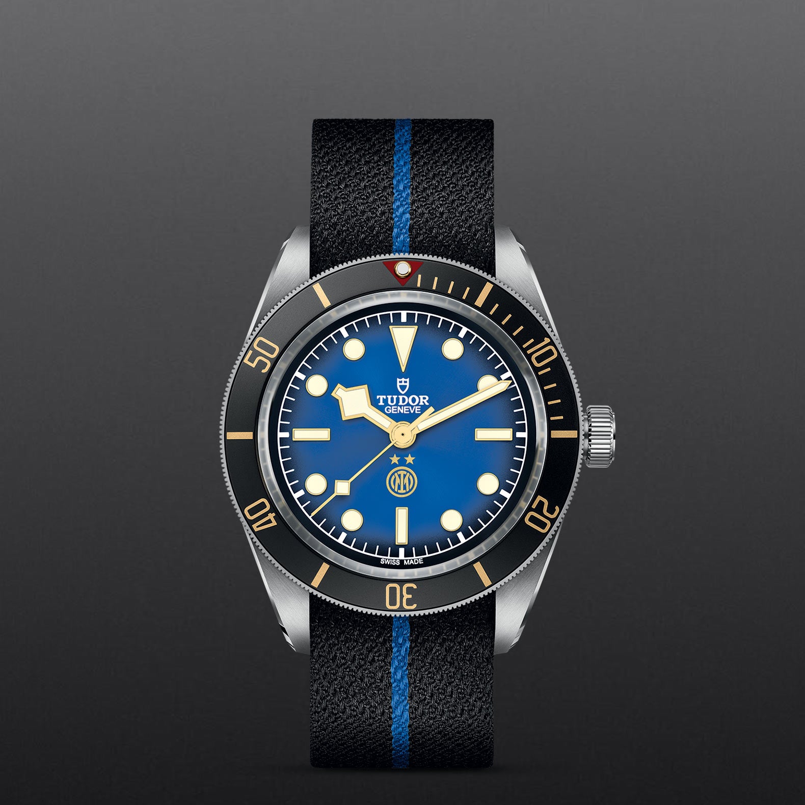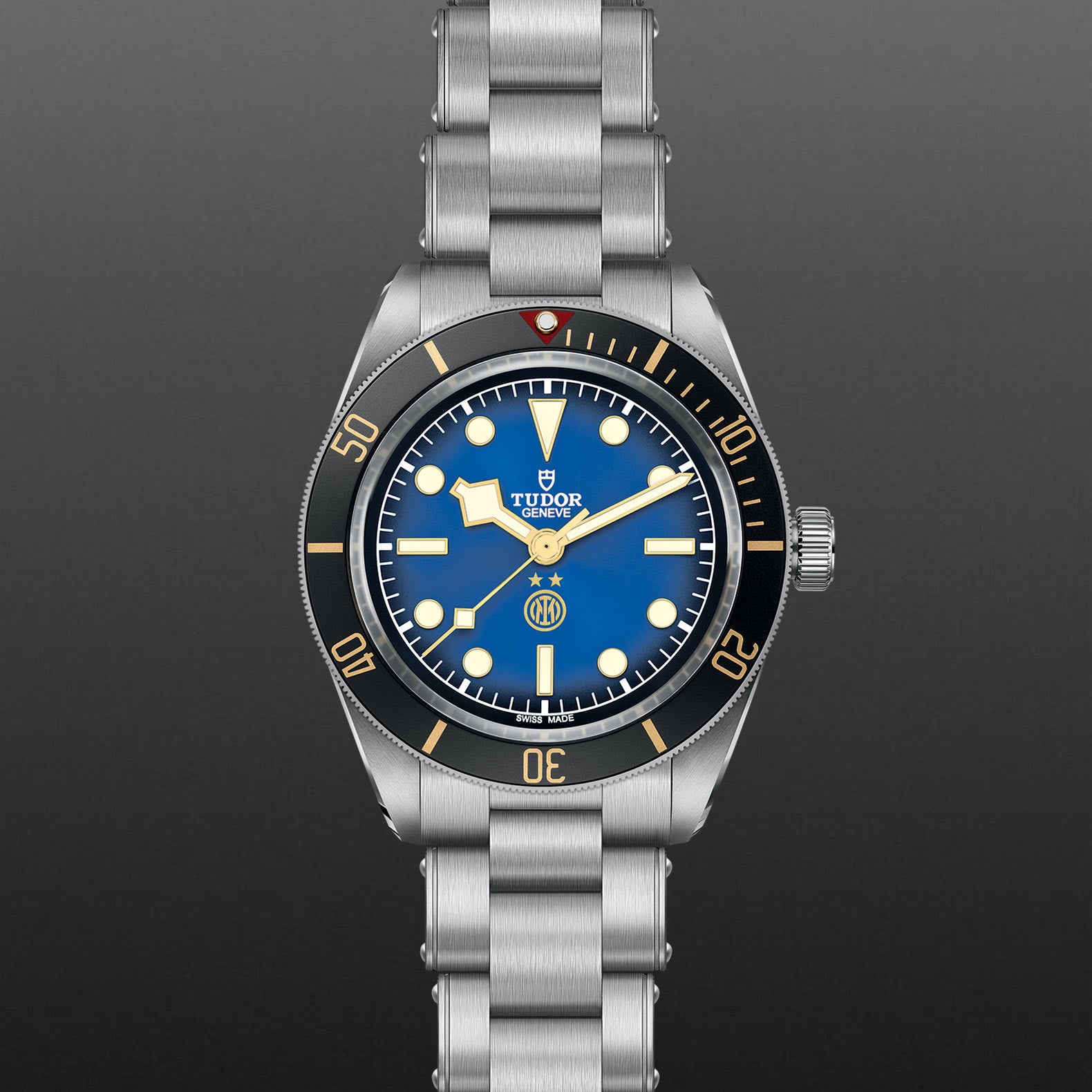 Exclusive “Inter blue” ombré dial with applied indexes and Inter logo with two stars at 6 o'clock. the winding crown is a screw-down steel one with the TUDOR rose in relief and a satin-finished steel crown tube with circular workmanship. The crystal is in domed sapphire. waterproof up to 200 m. the riveted steel bracelet with a polished and satin finish. This model has an autonomy of 70 hours.